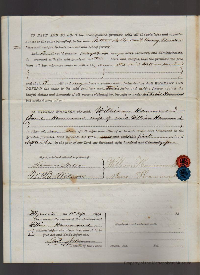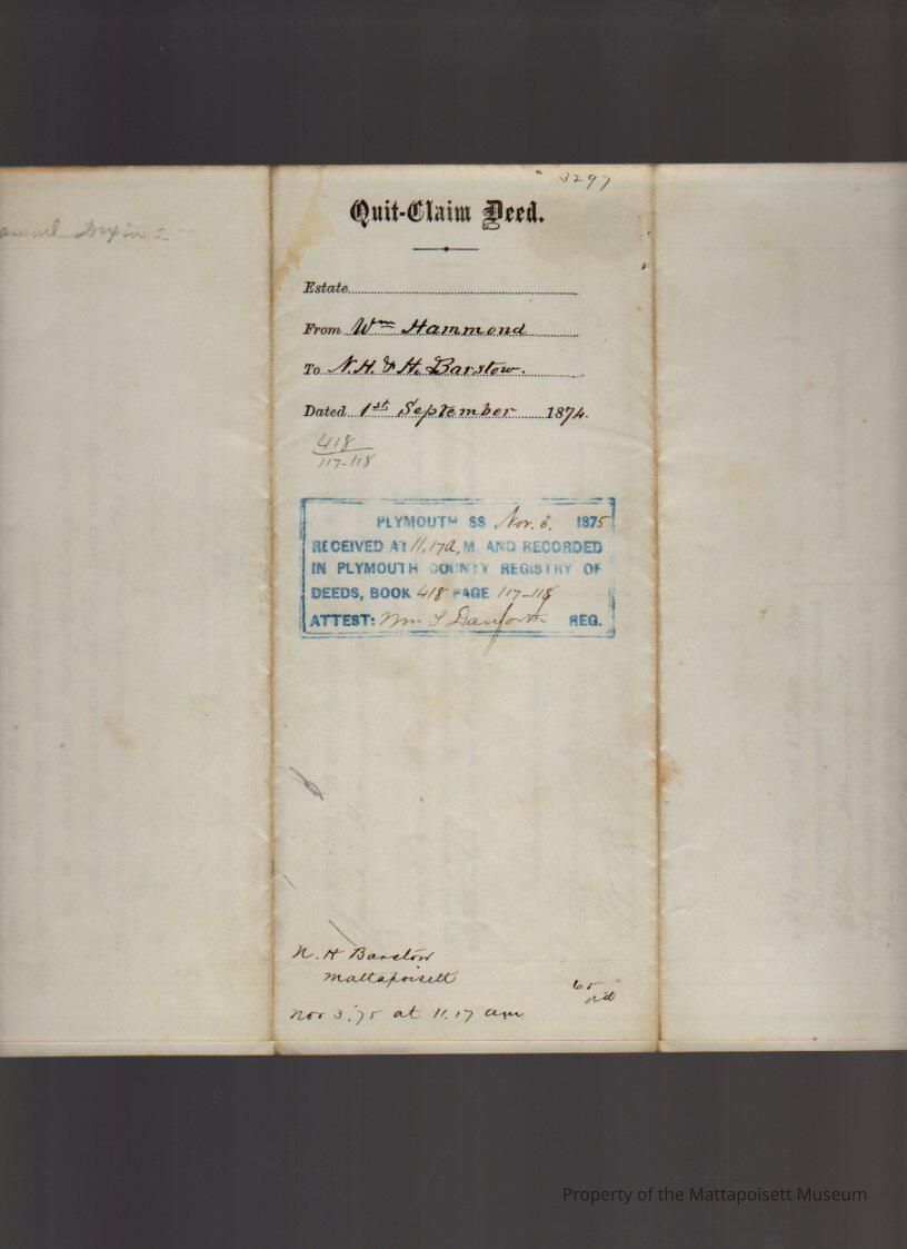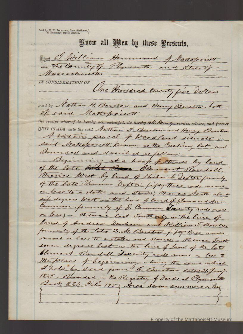 William & Jane Hammond to Nathan H. Barstow & Henry Barstow, 7 acres wood lot called “Cushing Lot” for $125.Collection