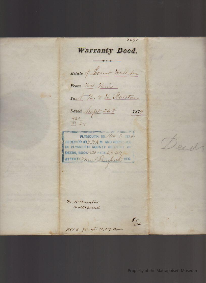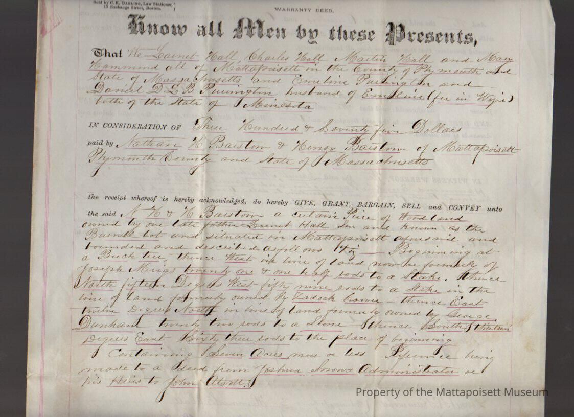 Larnet Hall, et al, heirs of Larnet Hall, to Nathan H. Barstow & Henry Barstow, 7 acres of wood land known as “Burrell Lot” for $375.Collection