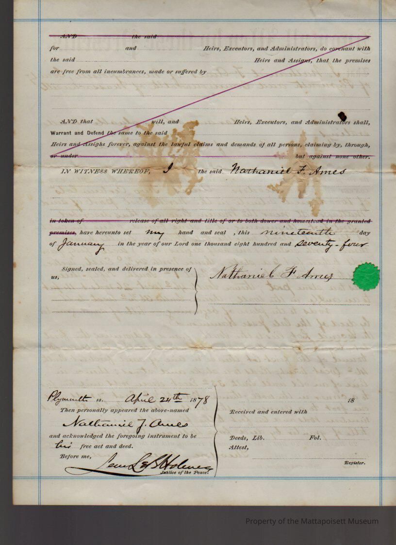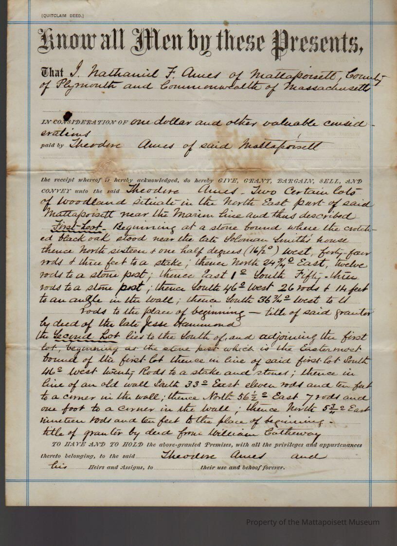 Nathaniel F. Ames to Theodore Ames, two lots of land in northeast Mattapoisett, near Marion for $1 and other valuable considerations.Collection