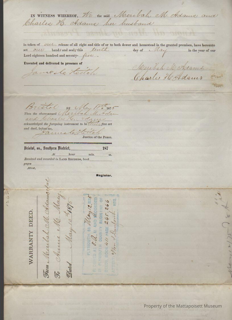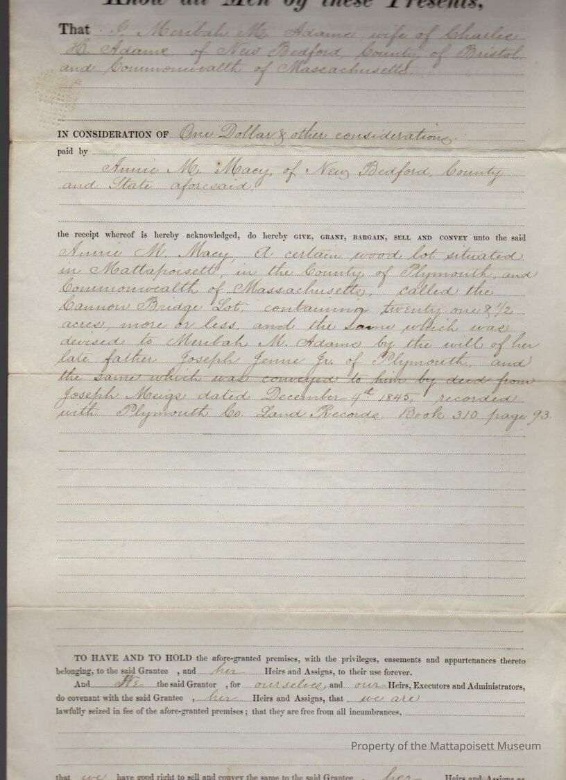 Meribah M. & Charles H. Adams of New Bedford to Annie M. Macy of New Bedford, wood lot known as “Cannon Bridge Lot”, 21 ½ acres for $1 and other valuable considerations.Collection
