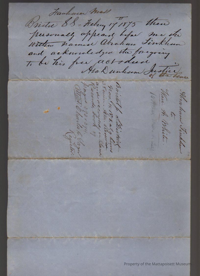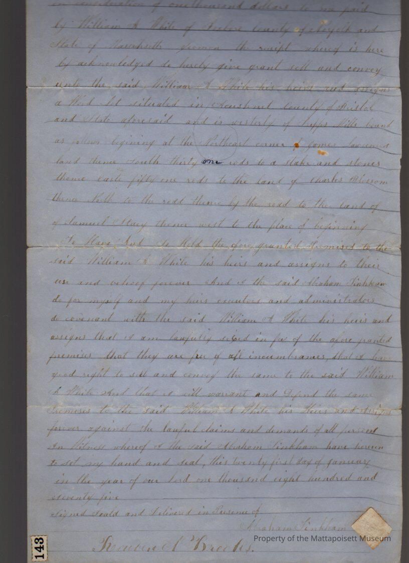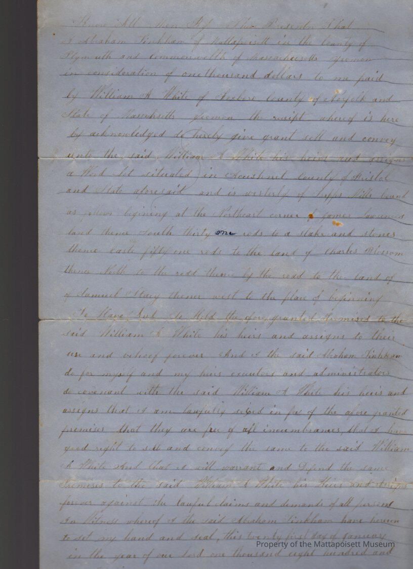 Abraham Tinkham to William A. White of Foxboro, wood lot in Acushnet for $1,000.Collection