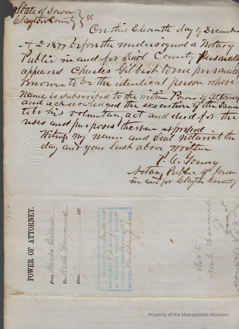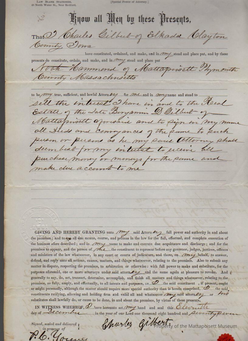 Charles Gilbert of Iowa, Power of Attorney to Noah Hammond, for the sale of the estate of Benjamin D. Gilbert.Collection