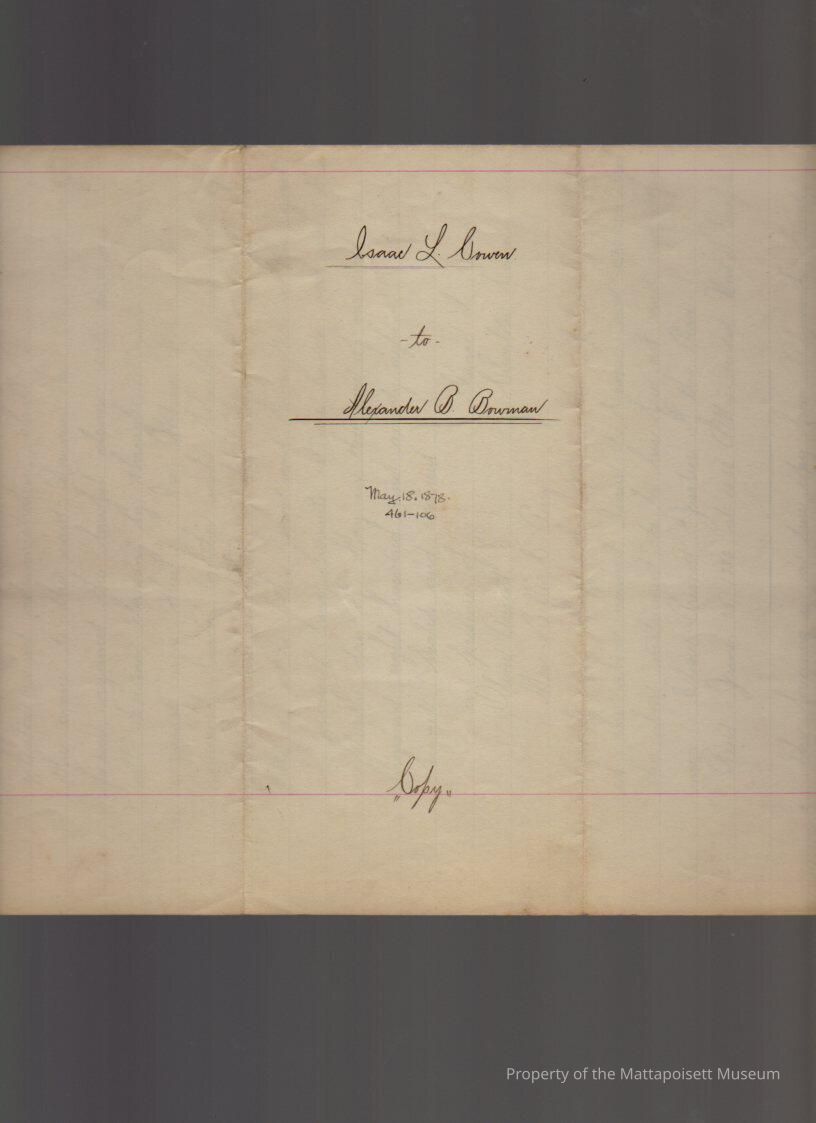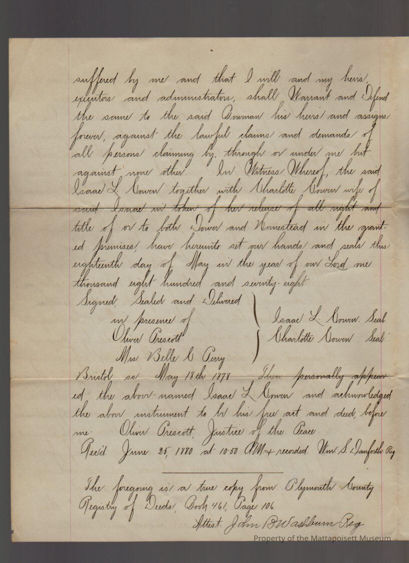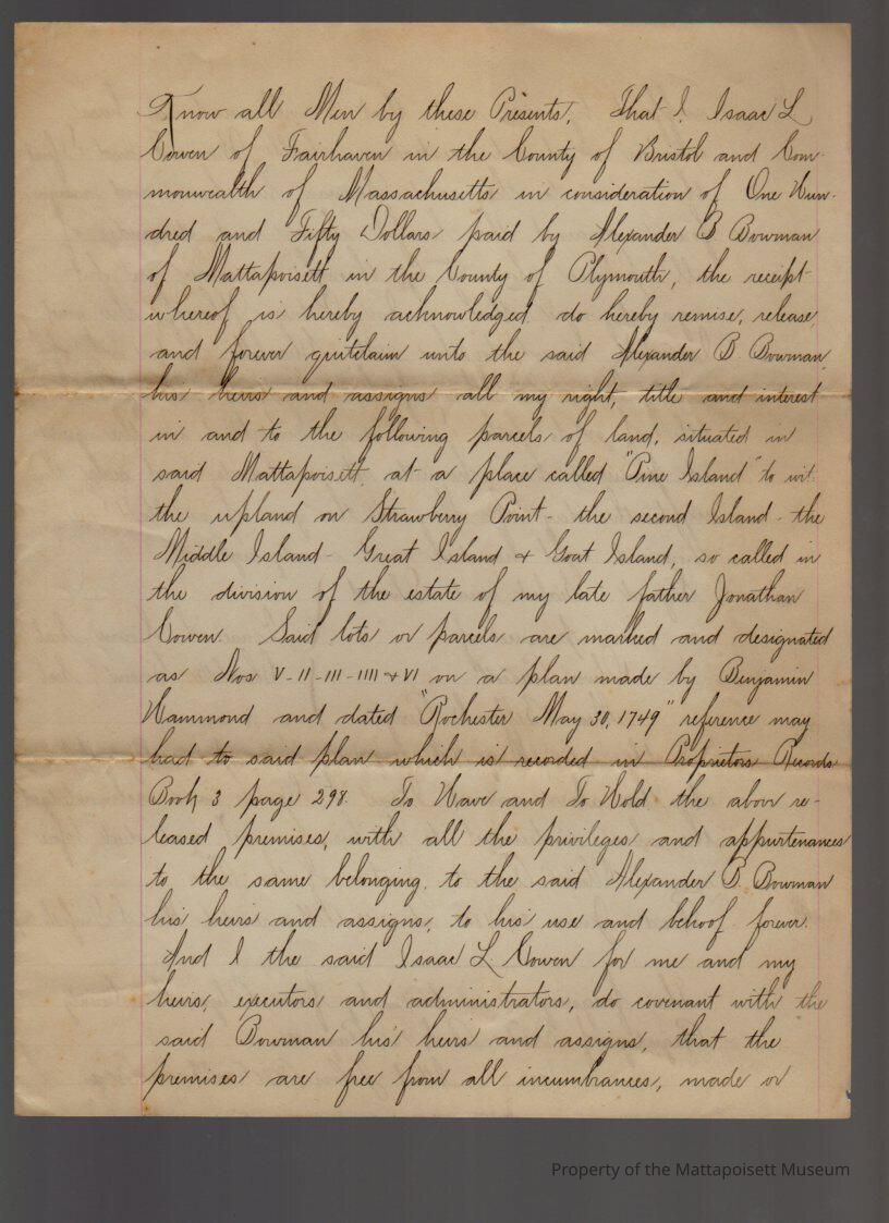 True copy, Isaac L. & Charlotte Cowen of Fairhaven to Alexander B. Bowman, several parcels on Pine Island for $150.Collection