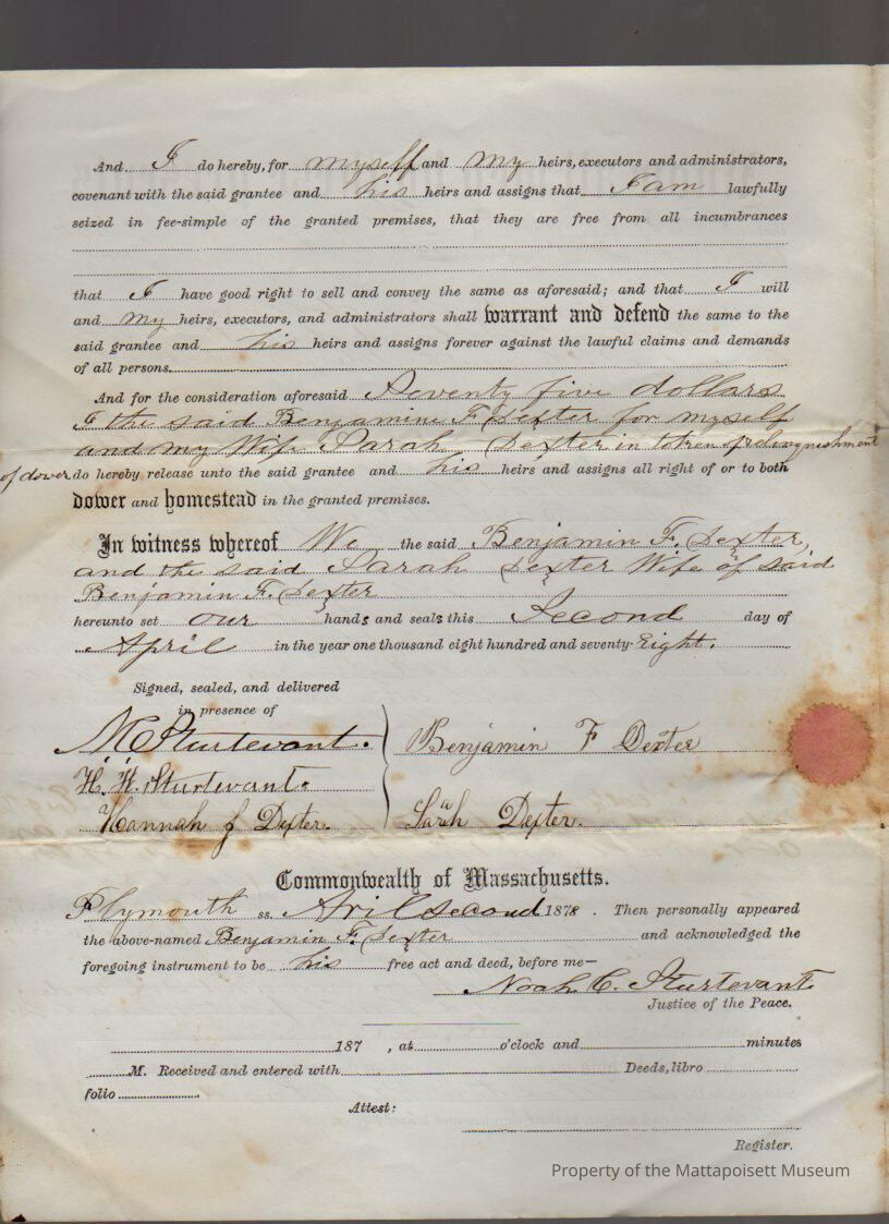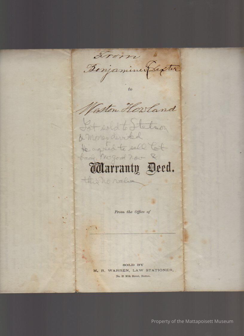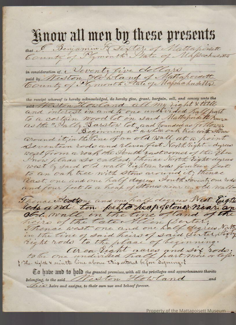 Benjamin F. & Sarah Dexter to Weston Howland, 8 acres, 6 rods of woodland known as ”Sally Barstow Lot” for $75.Collection