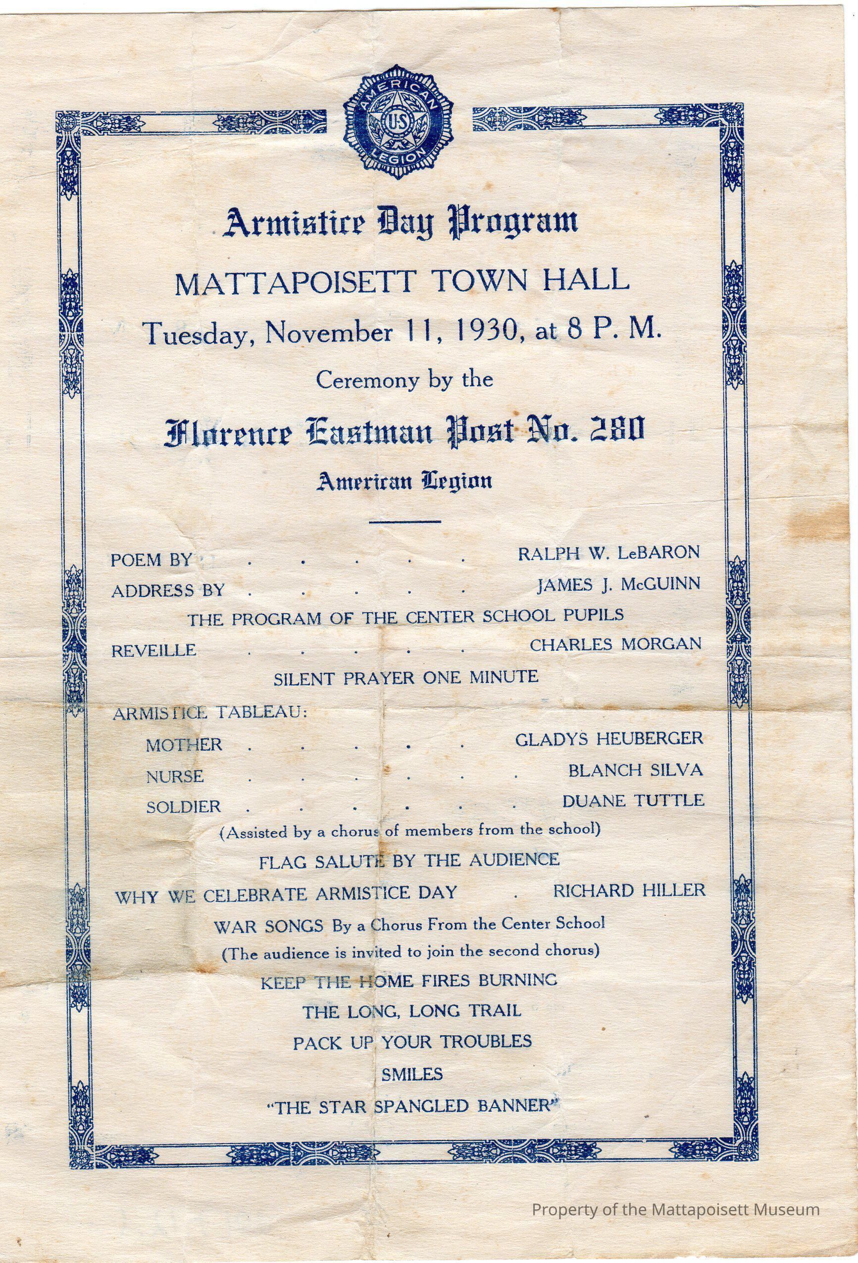 A program from an Armistice Day celebration held at the Mattapoisett Town Hall, Tuesday, November 11, 1930.Acquisition