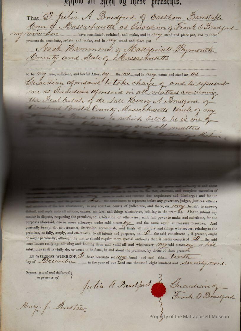 Julia A. Bradford, guardian of Frank I. Bradford, minor son of Eastham, Power of Attorney to Noah Hammond for sale of real estate of late Henry A. Bradford, uncle.Collection