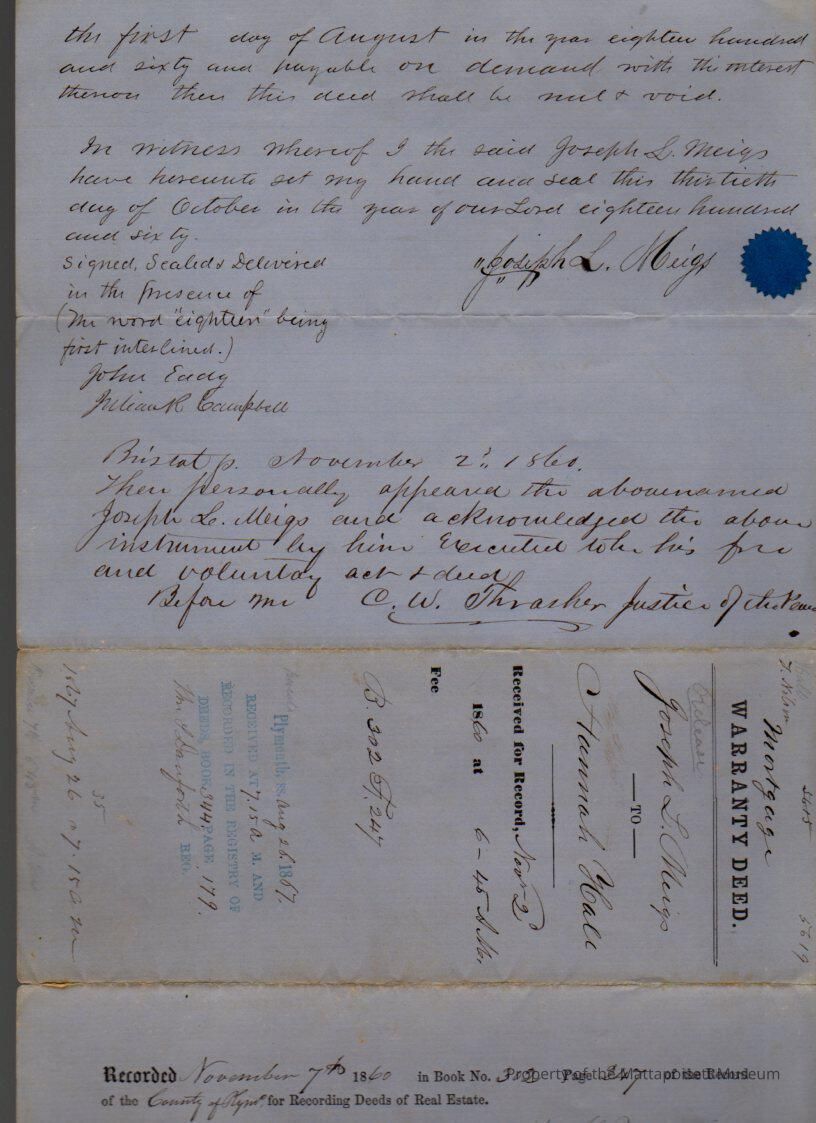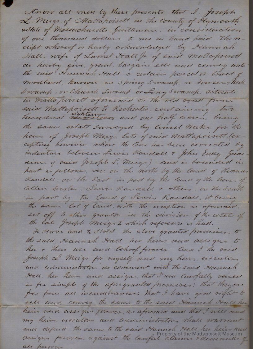 Joseph L. Meigs to Hannah Hall, wife of Larnet Hall Jr., 218 ½ acres of woodland known as “Spring Swamp” and other names for $1,000Collection