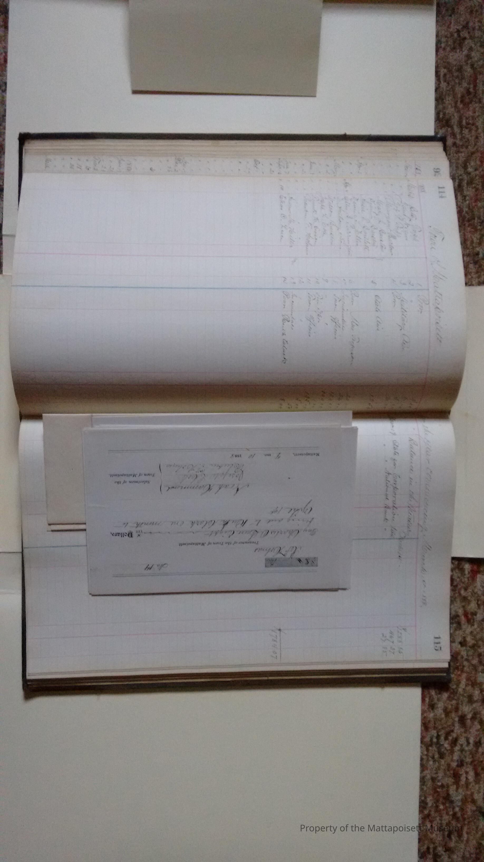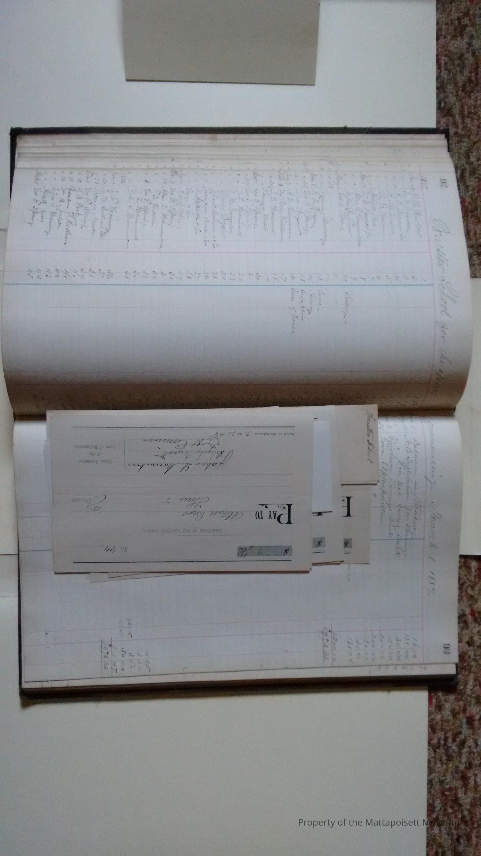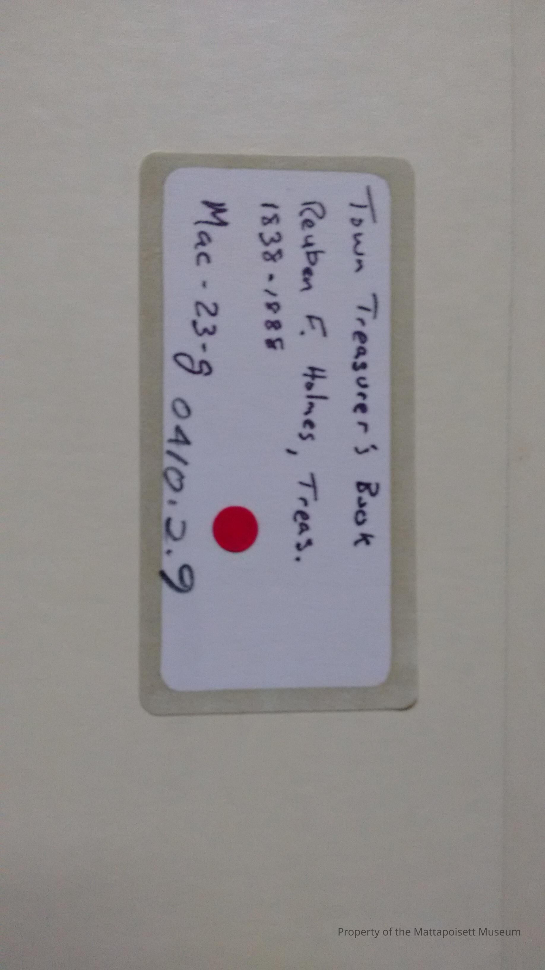 Town treasurer's book, Reuben F. Holmes, Treasurer. 1883-1888, includes entries on Military and State aid, various departments throughout the Town of Mattapoisett. Entry to Mrs. Olivia H. Purrington for the board of Seth Freeman at Taunton Lunatic Hospital for 6 months, ending April 1.Acquisition