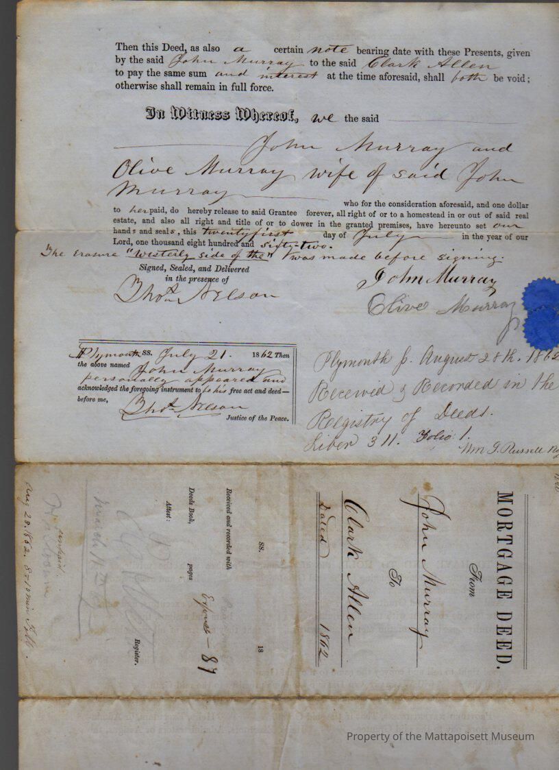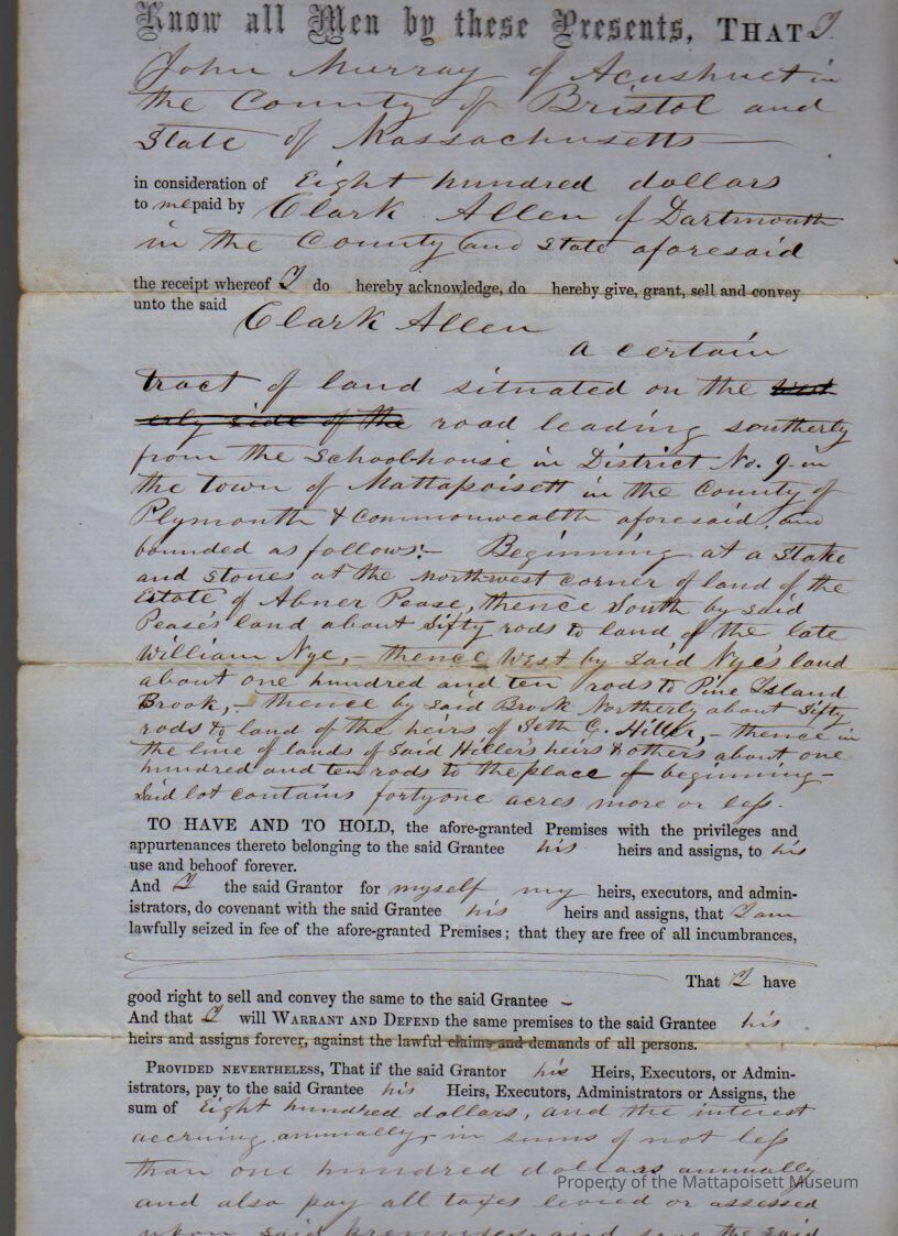 John & Olive Murray of Acushnet to Clark Allen of Dartmouth, 41 acres land on road leading south from District #9 school house for $800.Collection