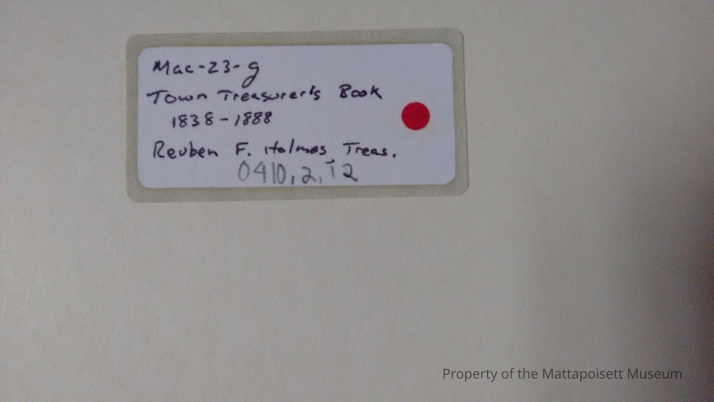 Account book, unidentified even though tag on cover indicates town treasurer's book.Acquisition