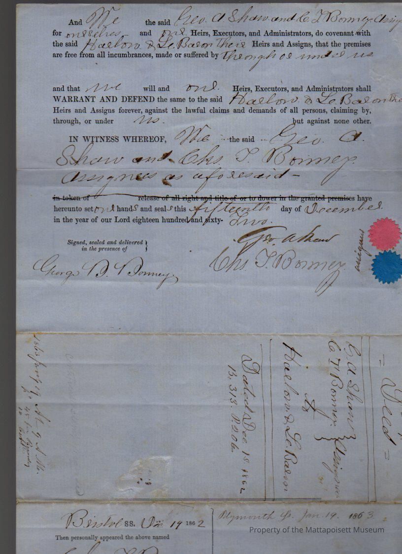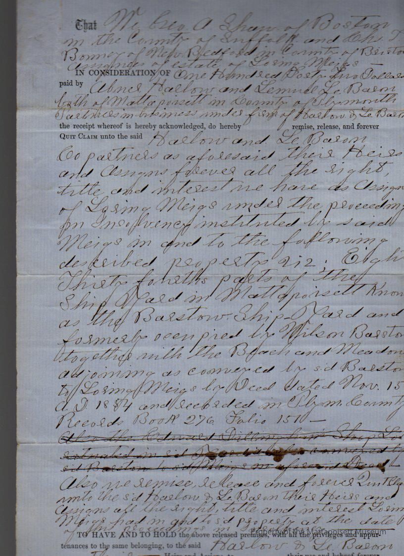 George A. Shaw of Boston & Charles T. Bonney to Abner Harlow & Lemuel LeBaron, 8/34 ship yard known as Barstow Ship Yard with beach and meadow.Collection