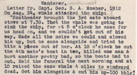 Letter from Capt. George S. A. Mosher, 1912, August 24, whale attacked his ship "Wanderer". In Tripp's scrapbook Vol. No. 2.1, p. 58Collection