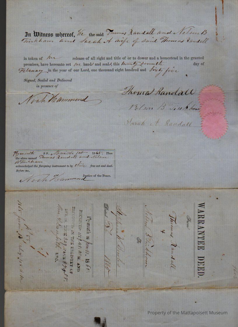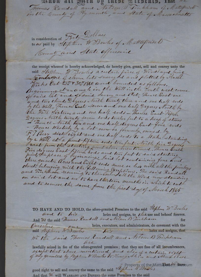 Thomas & Sarah A. Randall & Nelson B. Tinkham to Stephen W. Bowles, wood lot, 1 of 11, from 1860 survey of Ansel Weeks for $40.Collection