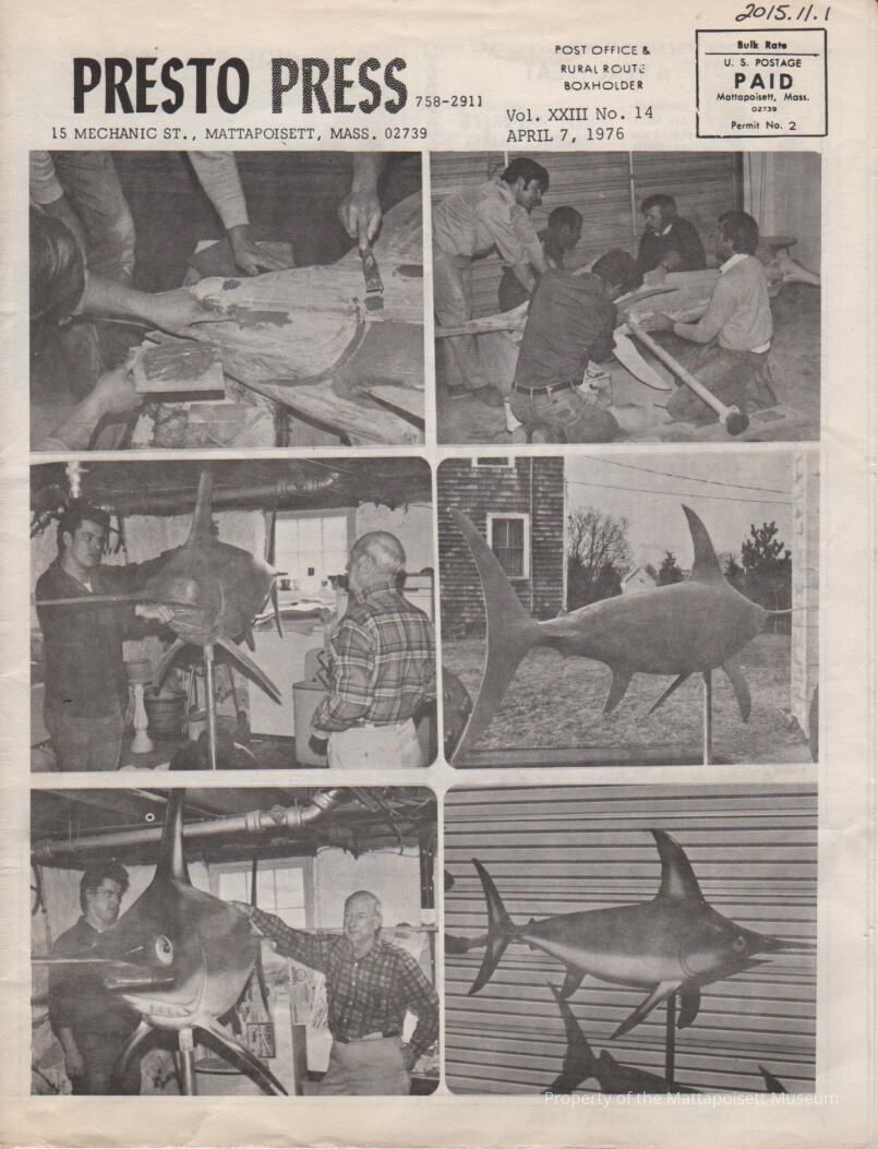 Cover page and article about restoration of swordfish weathervane on Long Wharf originally owned by F. Gilbert Hinsdale.Collection