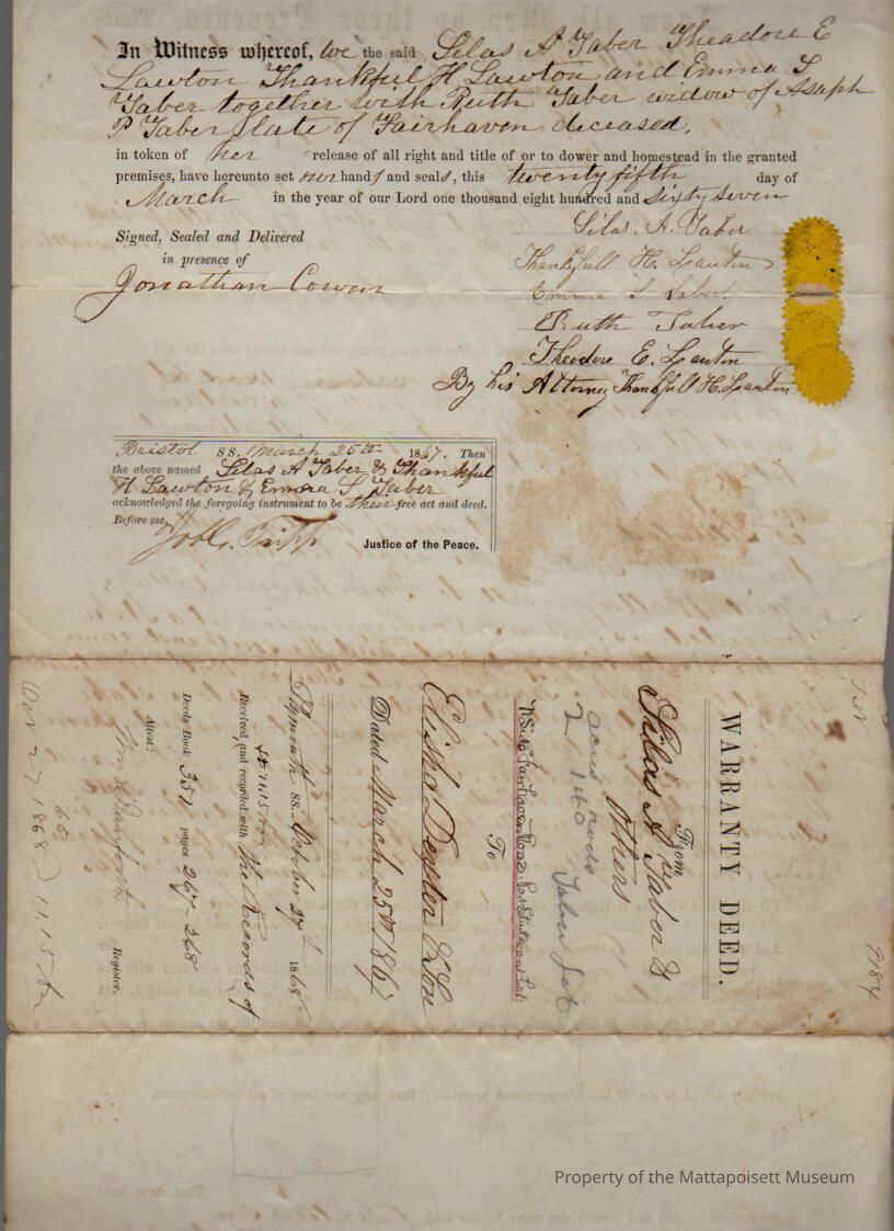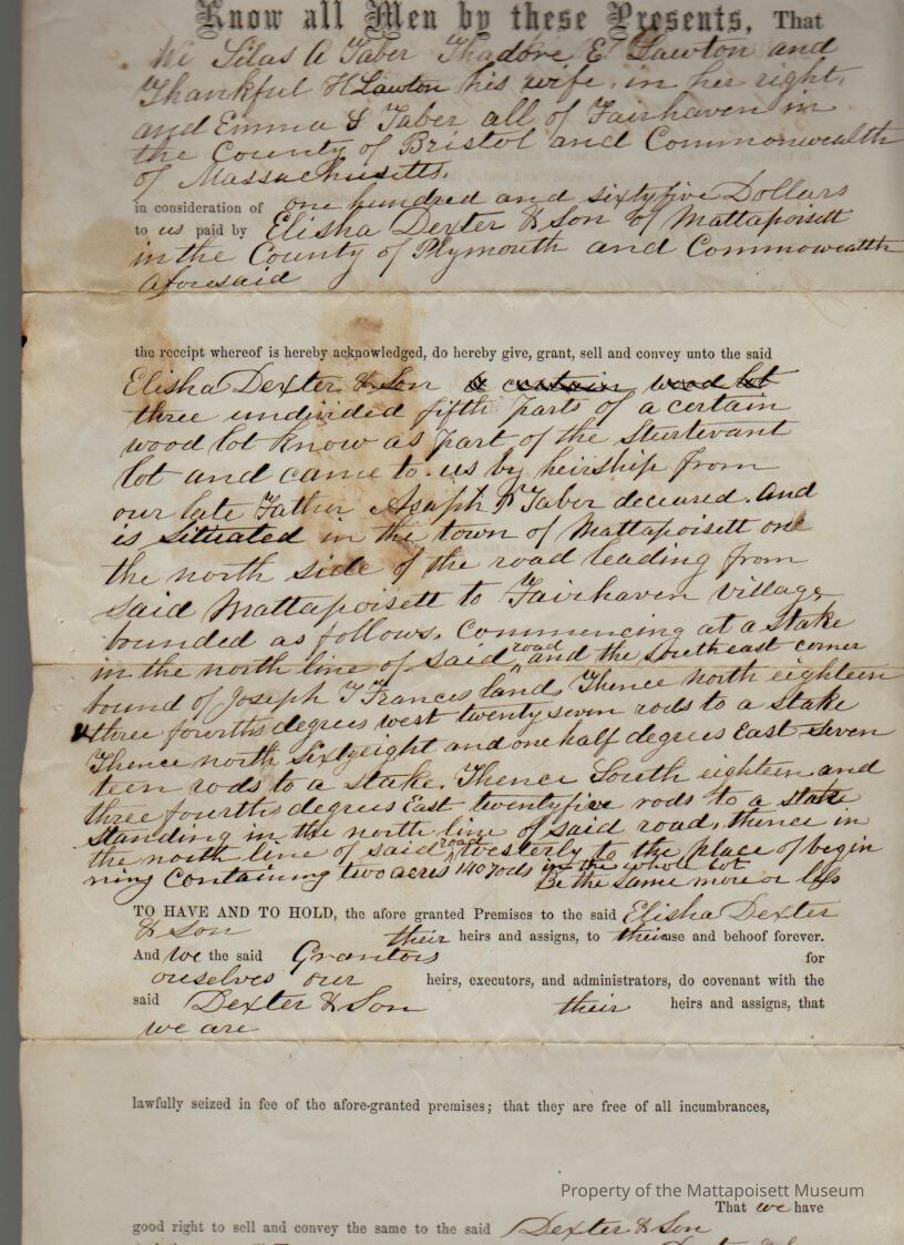 Silas A. Taber of Fairhaven, et al. to Elisha Dexter & son, 2 acres, 140 rods, 3/5 undivided of “Sturtevant Lot” for $165.Collection