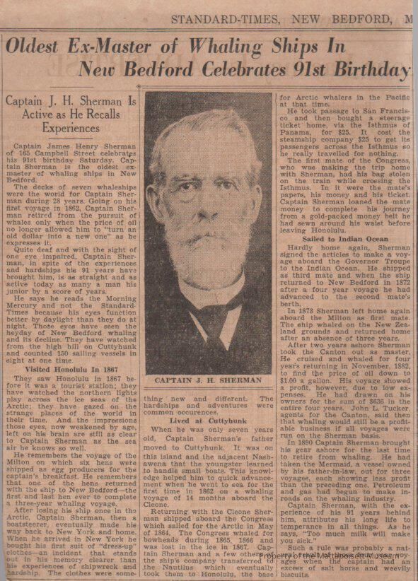 Oldest ex-master of whaling ships in New Bedford celebrates 91st birthday. Captain J. H. Sherman is active as he recalls experiences.Collection