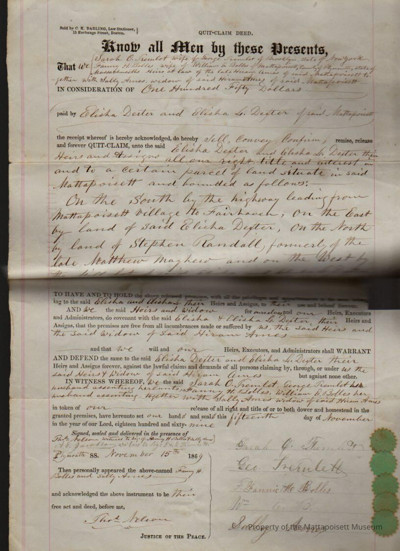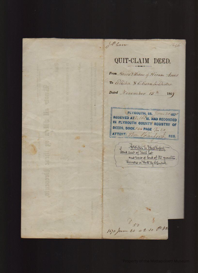 Sarah O. Tremont, et al., heirs & widow of Hiram Ames to Elisha Dexter & Elisha L. Dexter, parcel of east mill lot for $150.Collection