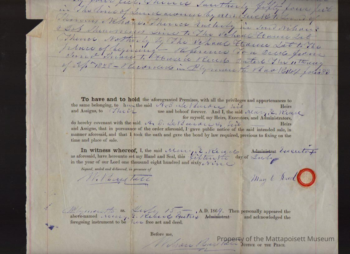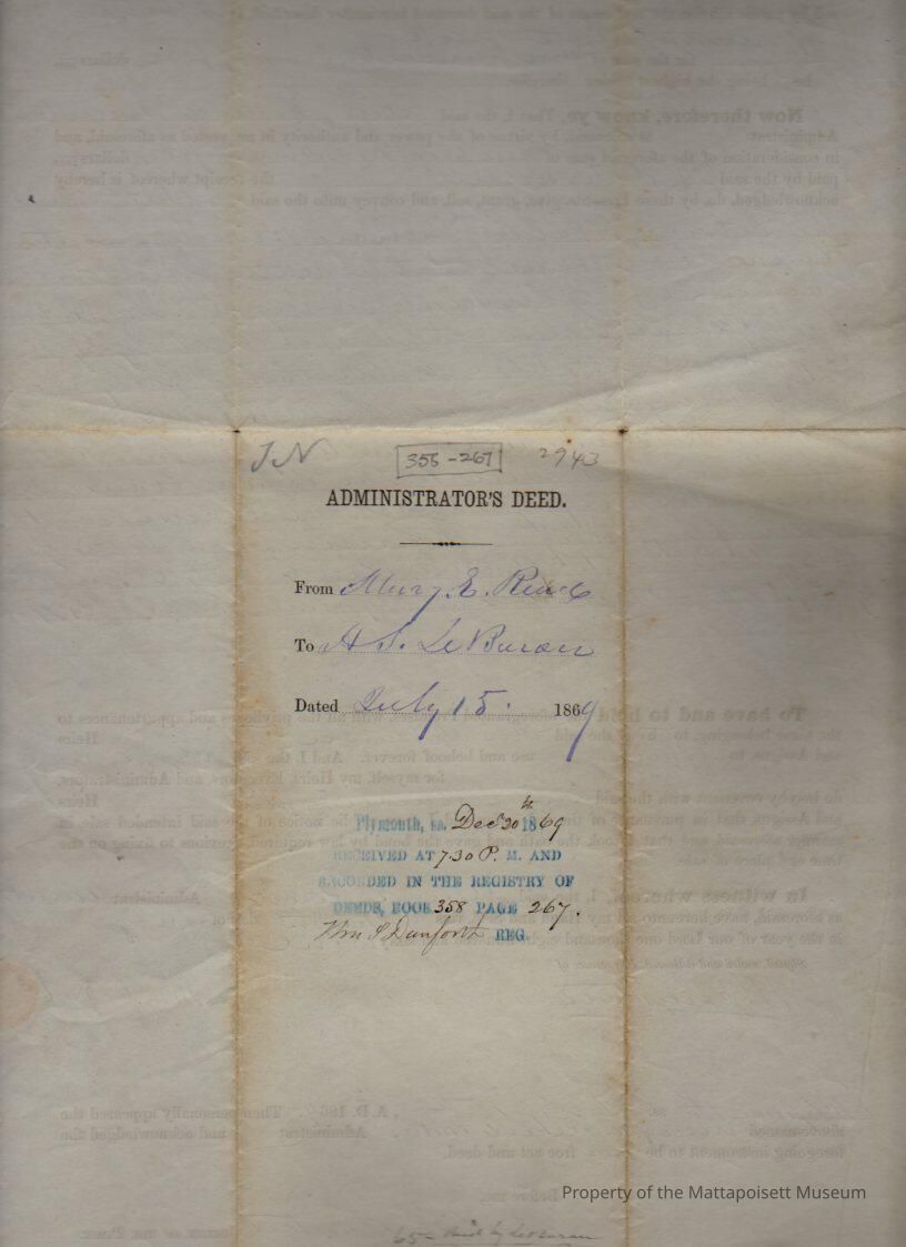 Mary E. Read of New Bedford, executrix of the late Hosea Read to Albert S. LeBaron, lot and house known as “Hosea Read House Lot” in Mattapoisett Village for $175..Collection