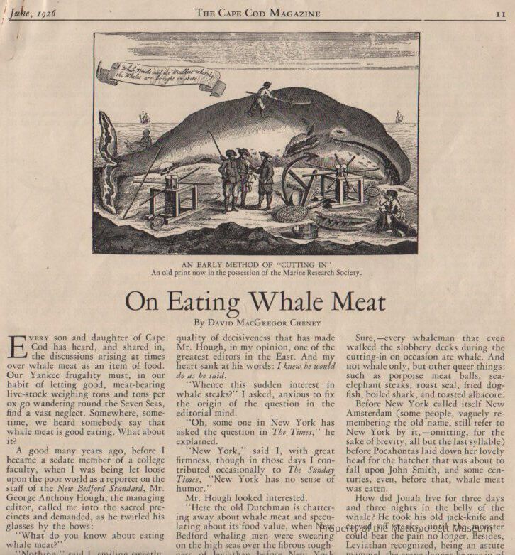 The Cape Cod Magazine article from June, 1926. On Eating Whale Meat. By David MacGregor Cheney.Collection