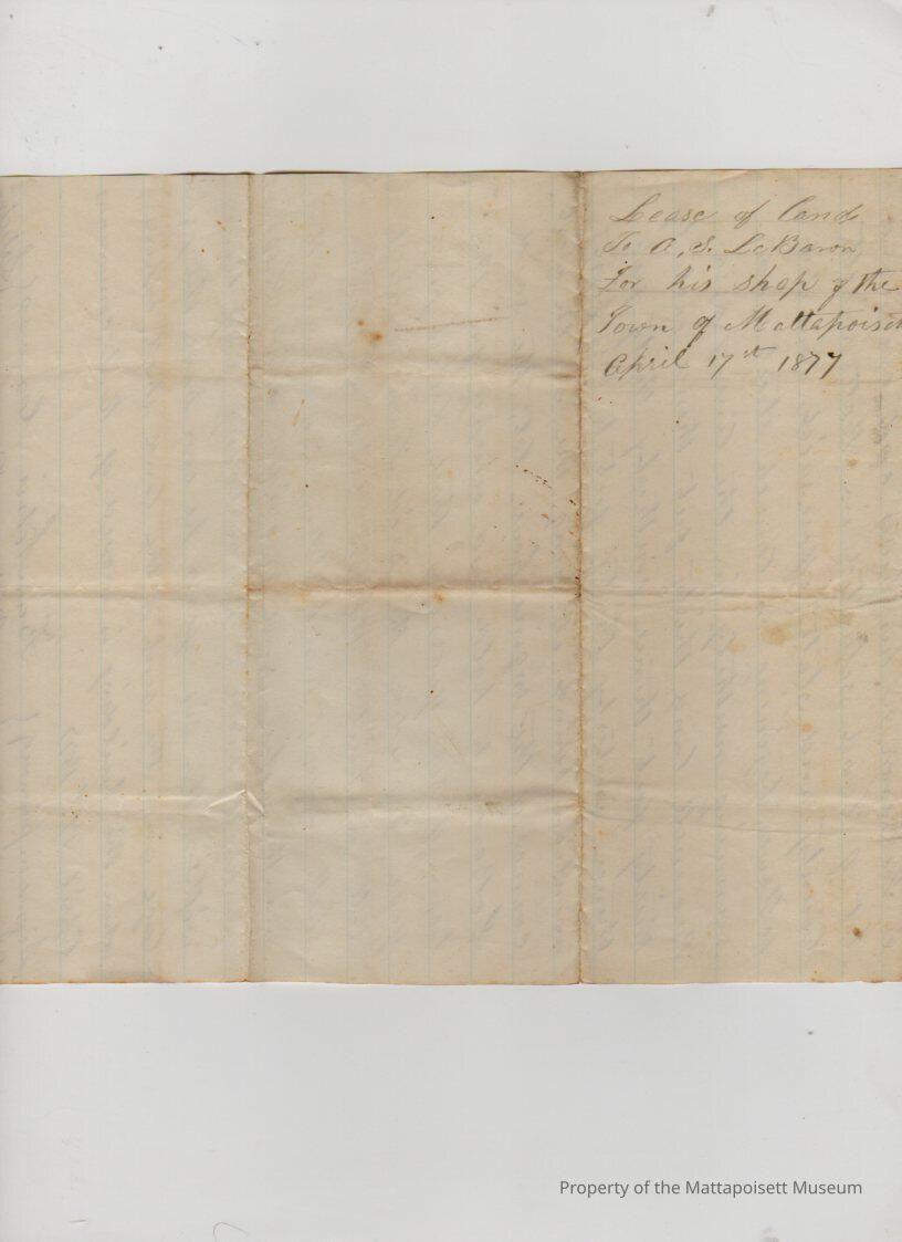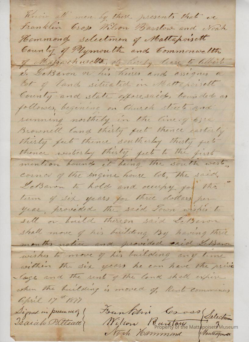 Franklin Cross, Wilson Barstow & Noah Hammond, selectmen of Mattapoisett. Lease of land to Albert S. LeBaron for his shop in the town of Mattapoisett.Collection