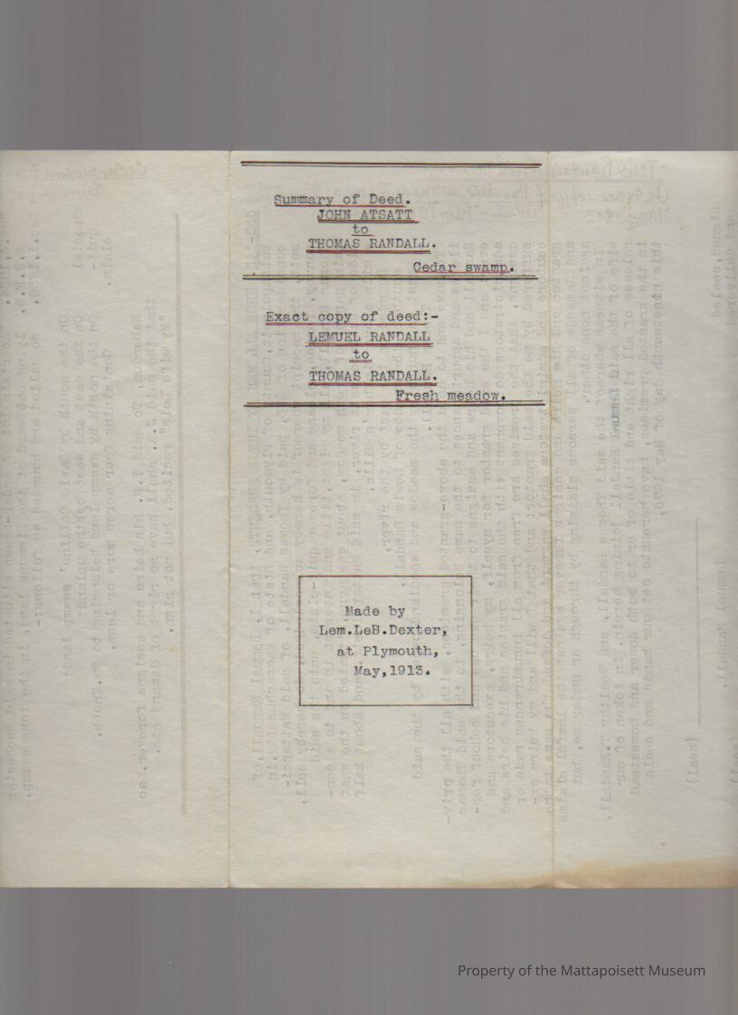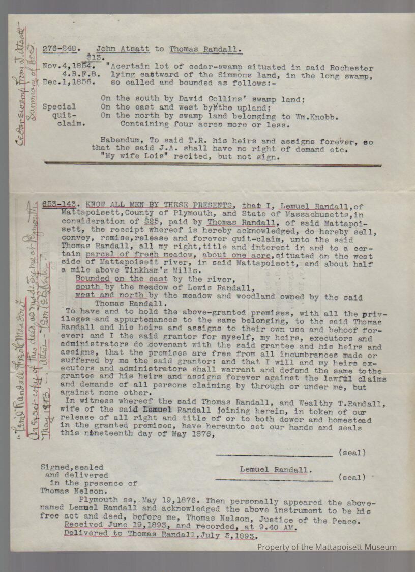 Lemuel Randall to Thomas Randall, 1 acre of fresh meadow for $25. Copy.Collection