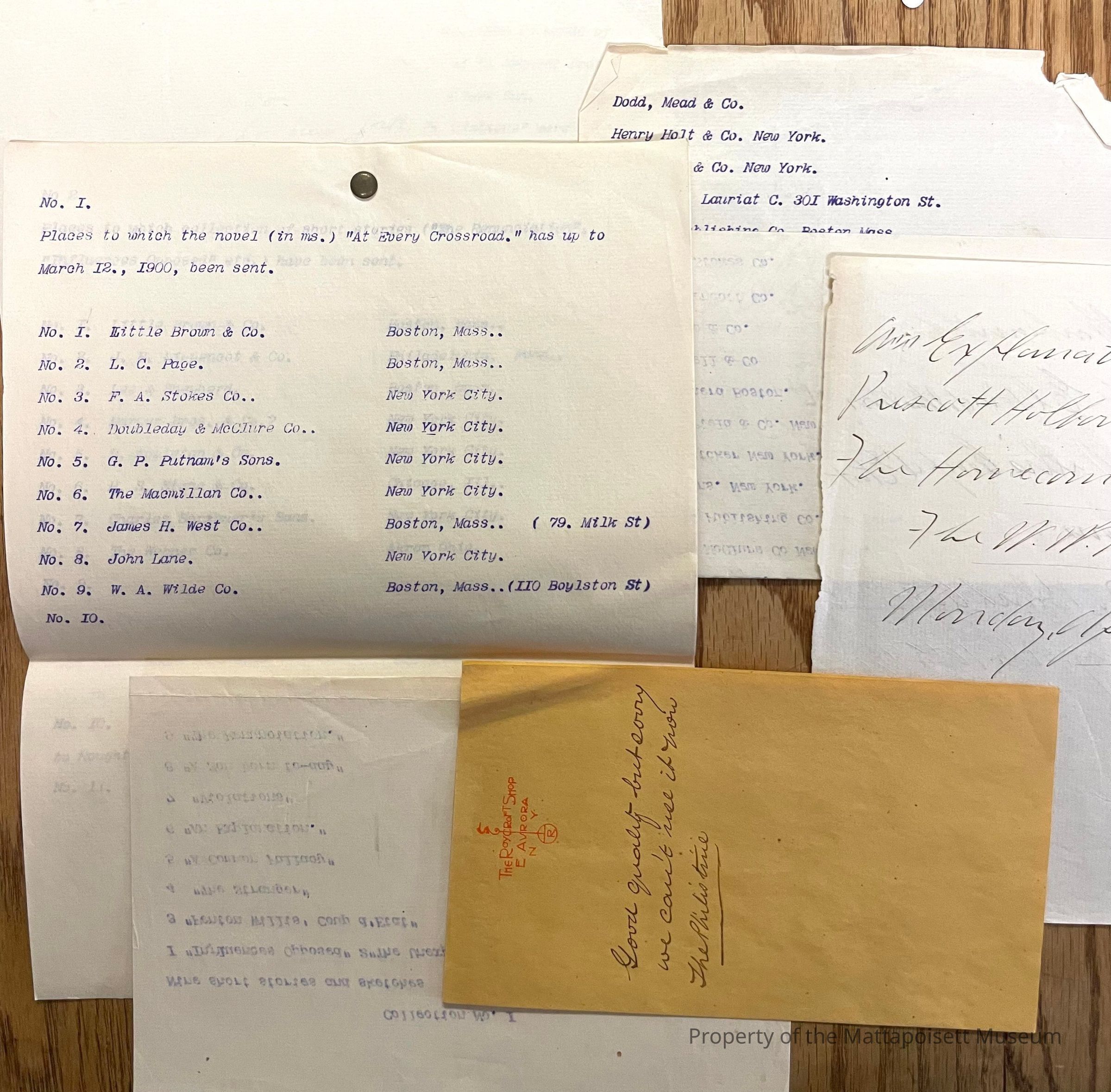 Everything in the collection (letters, manuscripts, typewriter, wedding dress, documents, books) was found in the attic of 18 Pine Island Road, Mattapoisett in 2022 and donated by the new house owners. This house was owned by Harrington and his wife. They subdivided the land and created Winnatuxett Beach Rd. George and Marian Harrington were the first couple ever married in St. Philips Church on Water Street. They were married in 1898.