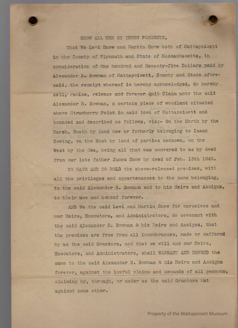 Levi & Sara S. Snow and Martin & Eunice C. Snow to Alexander B. Bowman, woodland above Strawberry Point for $175. Typed copy.Collection