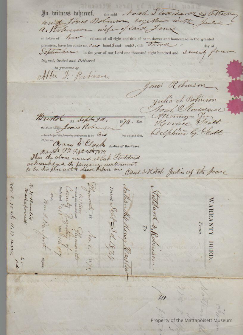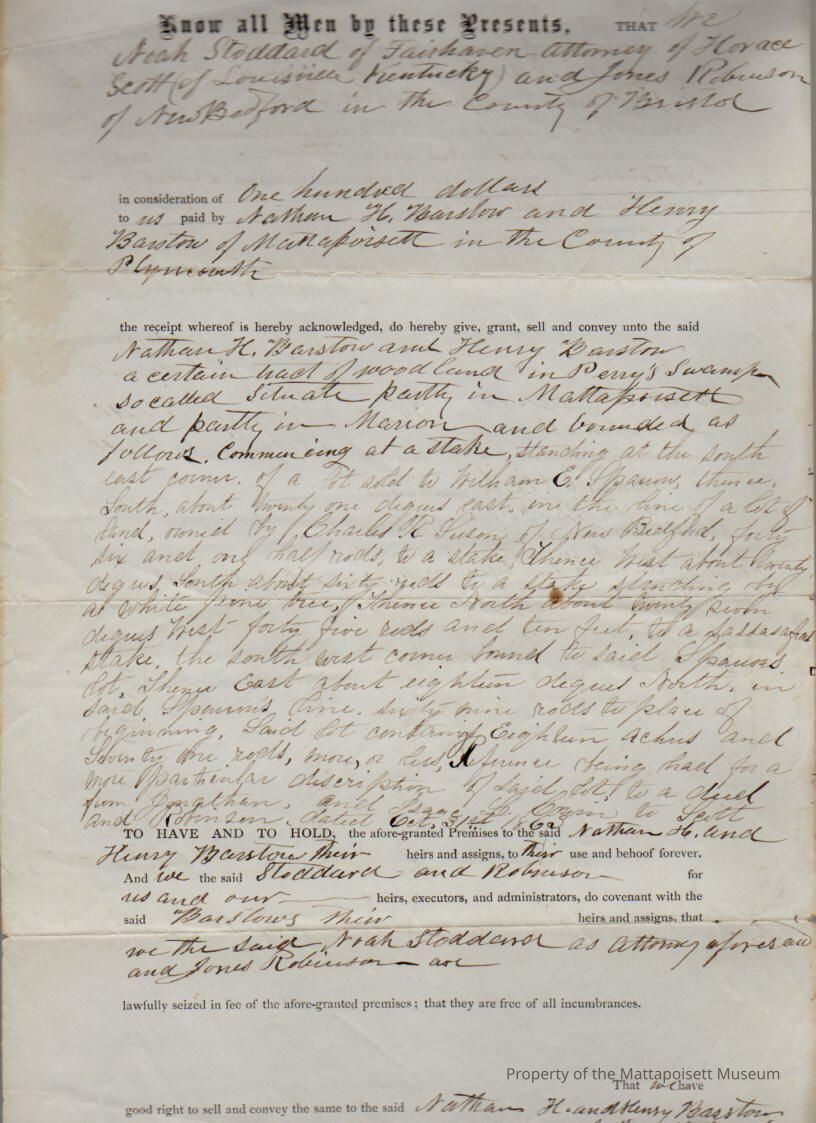 Noah Stoddard of Fairhaven, attorney for Jones & Julia A. Robinson and Horace & Delphinia G. Scott to Nathan H. Barstow & Henry Barstow, 18 acres, 17 rods of woodland at Perry's Swamp for $100Collection