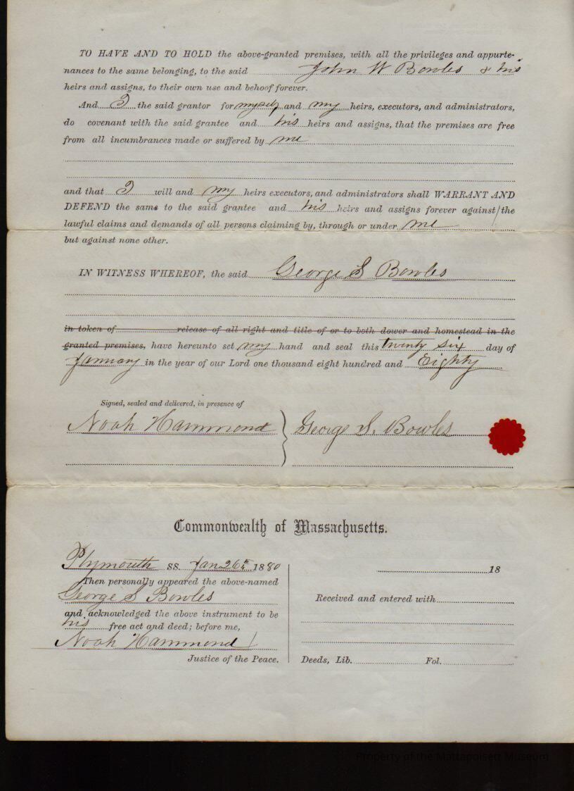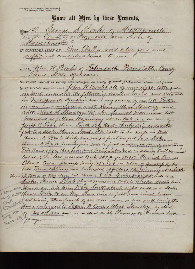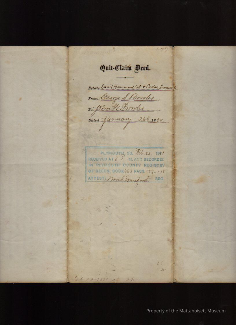 George S. Bowles to John W. Bowles of Falmouth, “Samuel Hammond Lot” & cedar swamp for $1 and other good and sufficient considerations.Collection