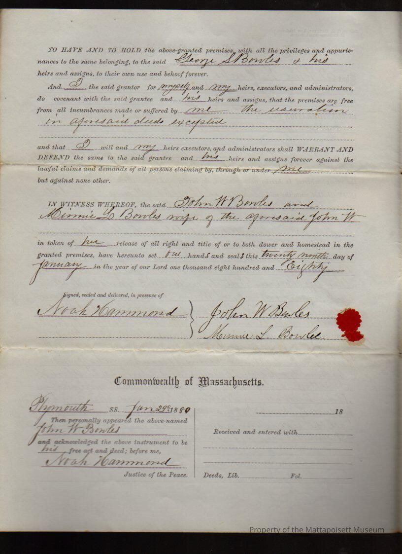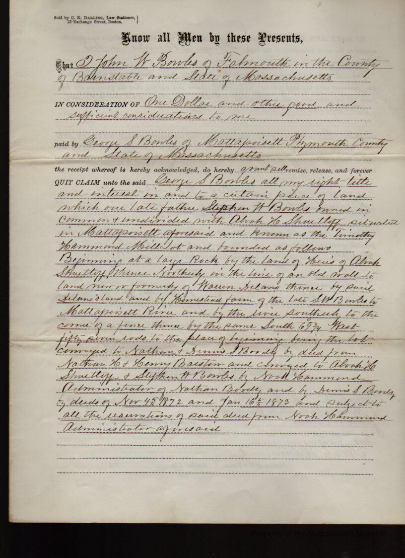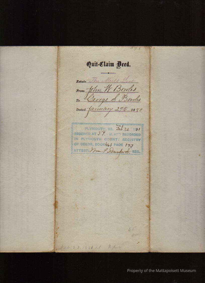 John W. & Millie L. Bowles of Falmouth to George S. Bowles, “Tim Hammond Mill Lot” for $1 and other good and sufficient considerations.Collection