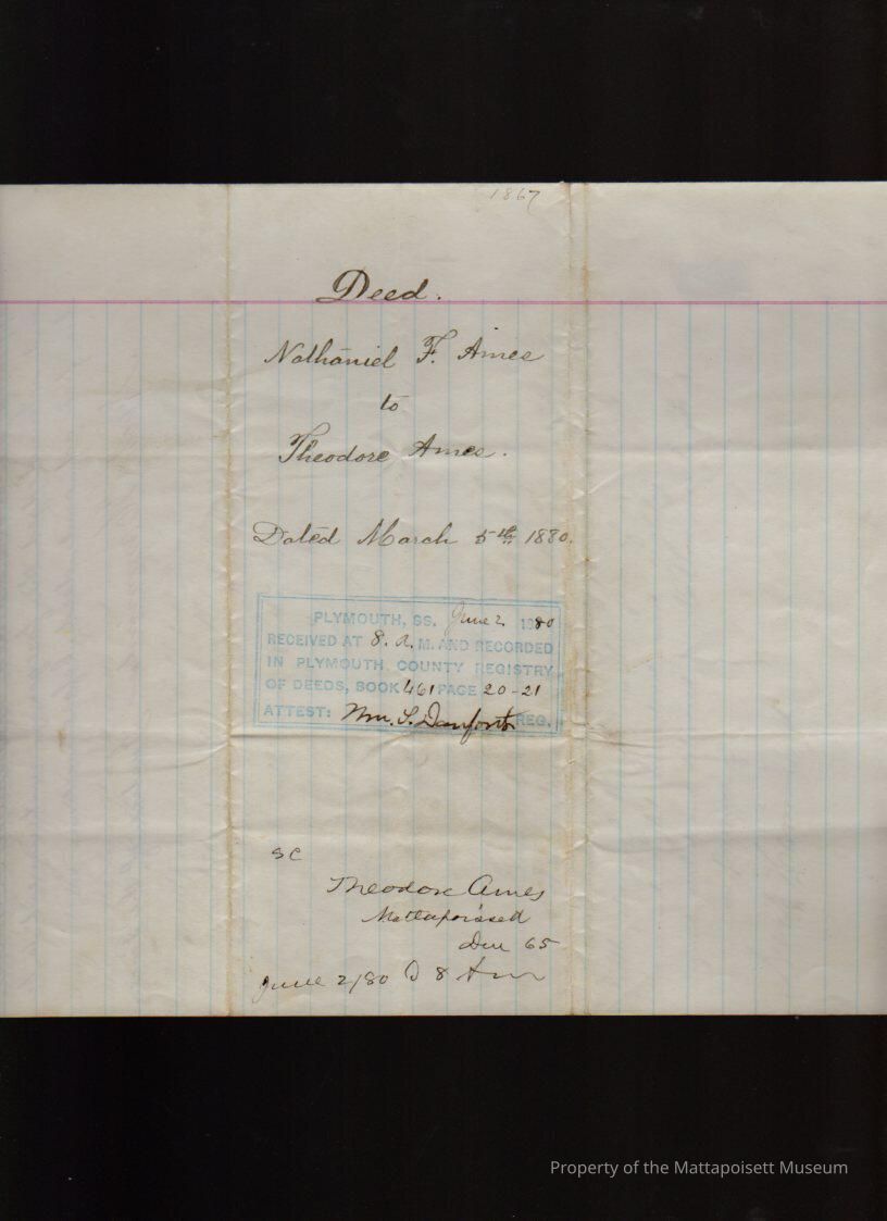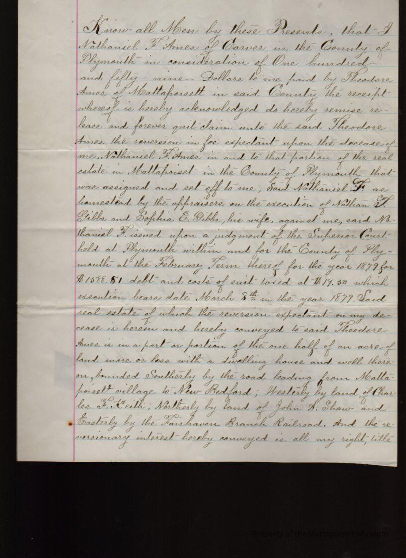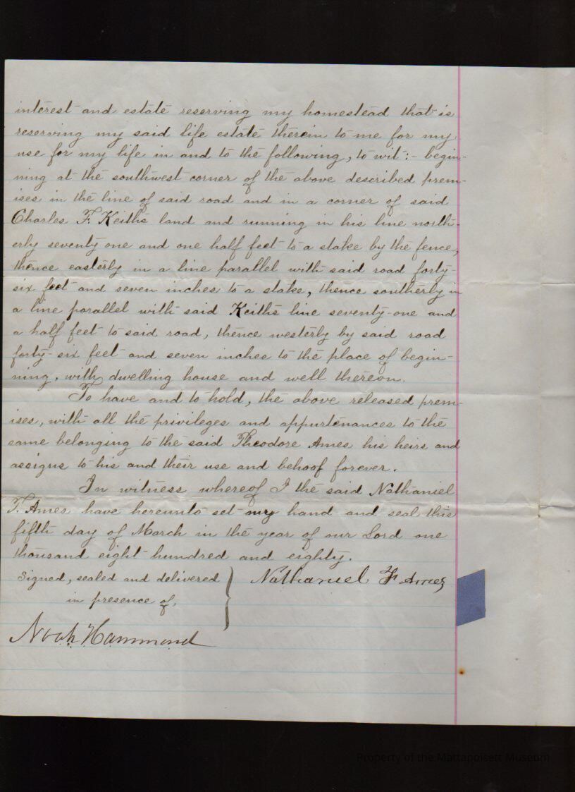 Nathaniel F. Ames of Carver to Theodore Ames, ½ acre land and dwelling house for $159.Collection