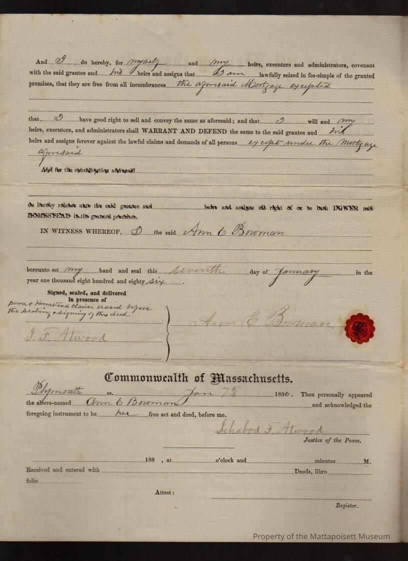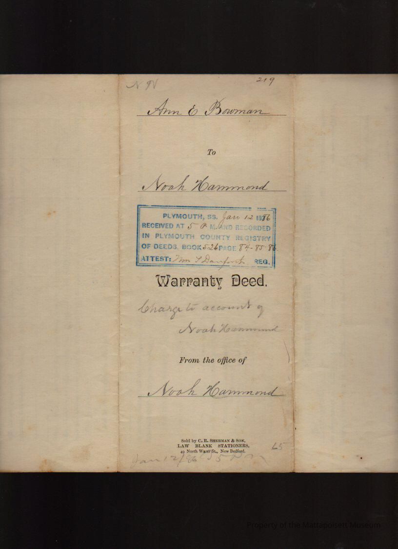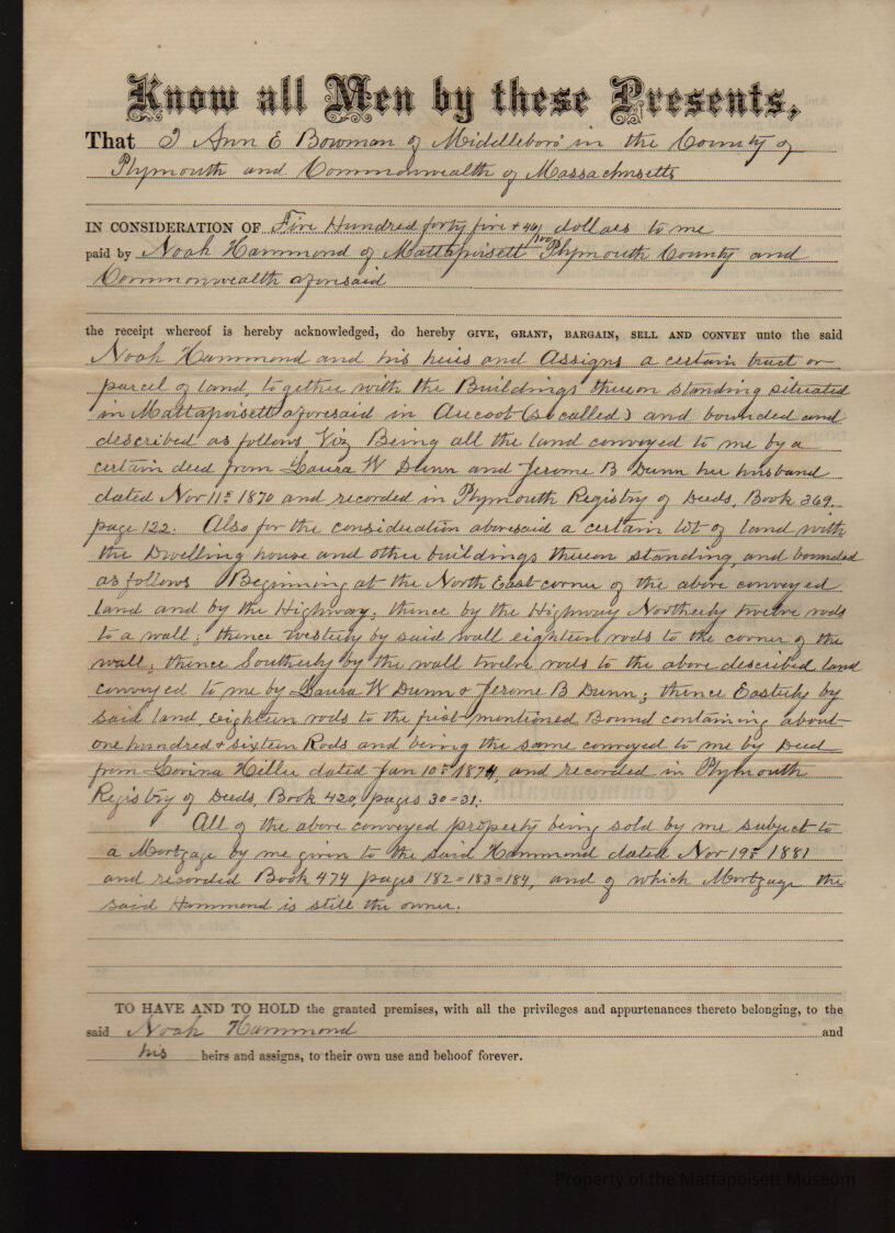 Ann E. Bowman of Marlborough to Noah Hammond, 116 rods and building in Aucoot for $540.46.Collection
