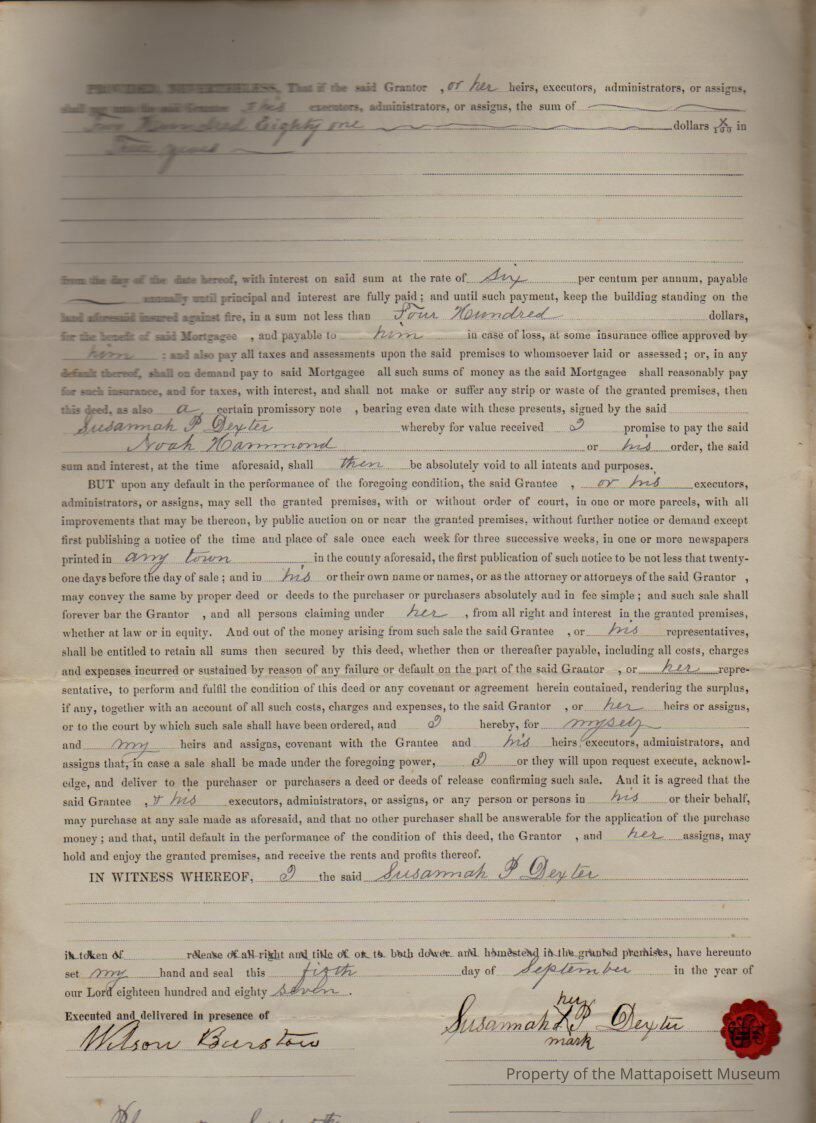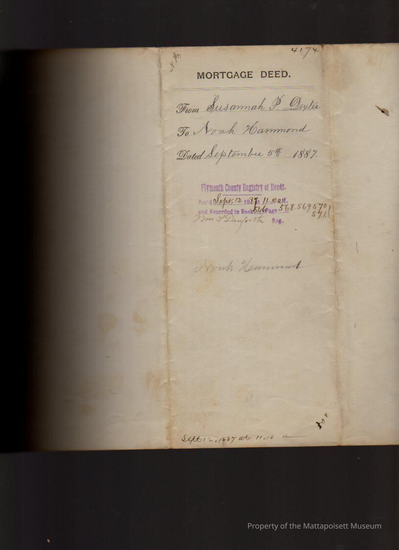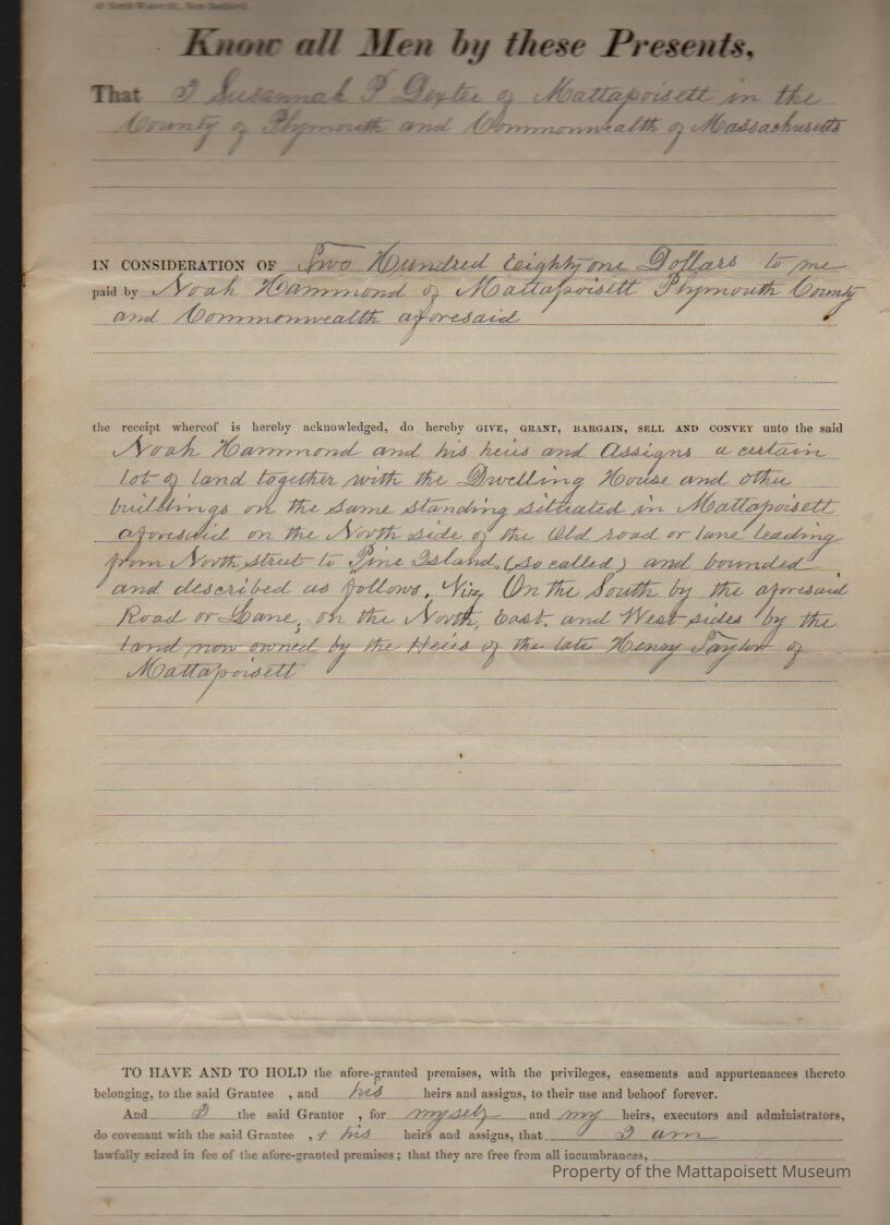 Susannah P. Dexter to Noah Hammond, land, dwelling house and buildings, north of “Old Road” leading from North Street to Pine Island for $281.Collection