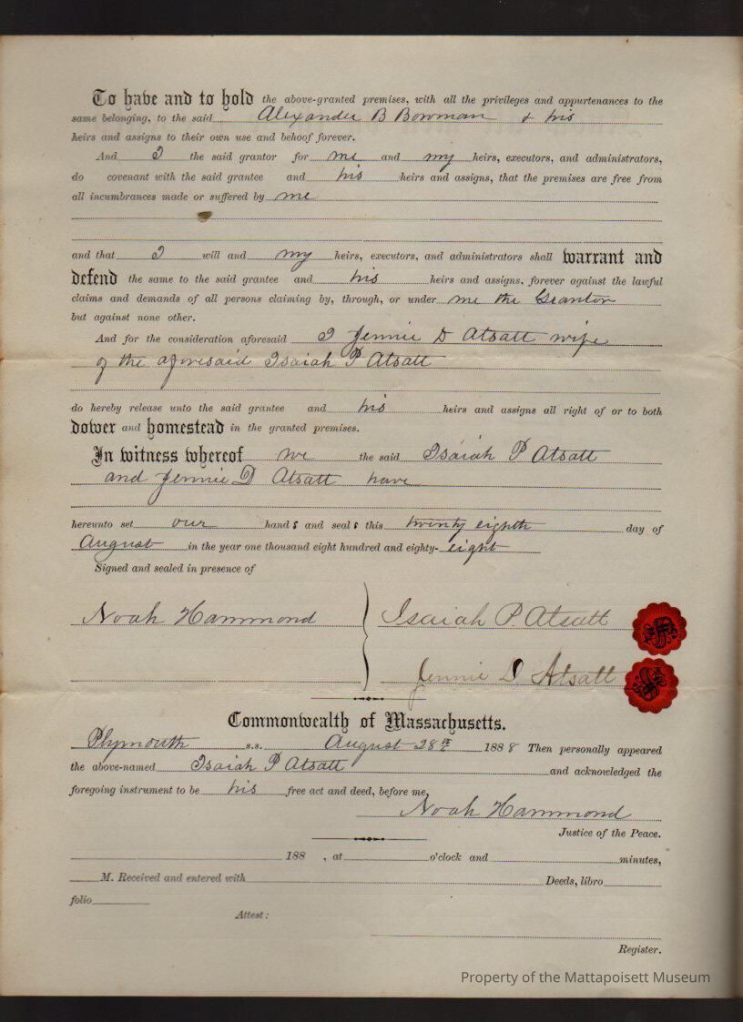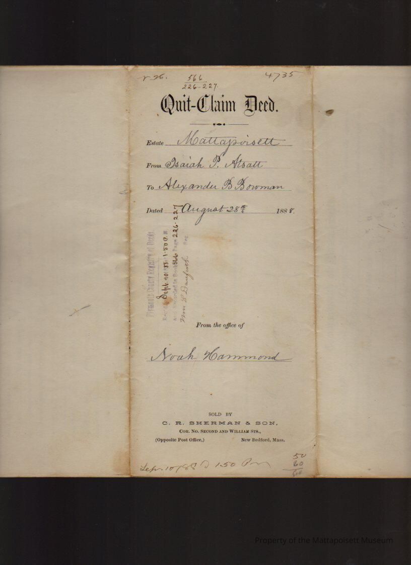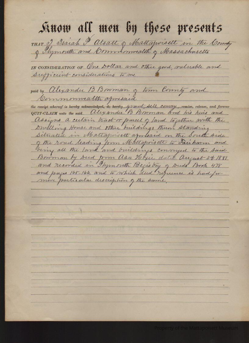 Isaiah P. & Jennie D. Atsatt to Alexander B. Bowman, land, dwelling house and other buildings south of road from Mattapoisett to Fairhaven for $1 and other good and sufficient considerations.Collection