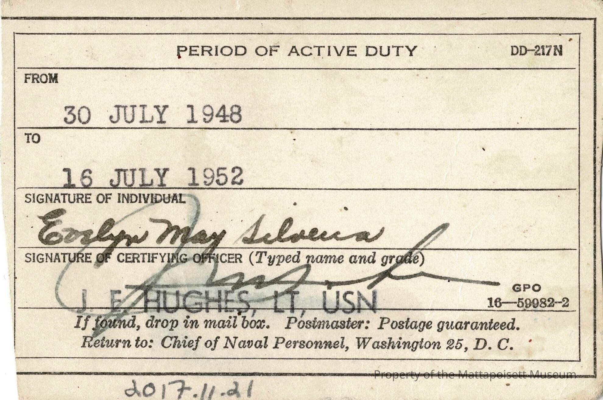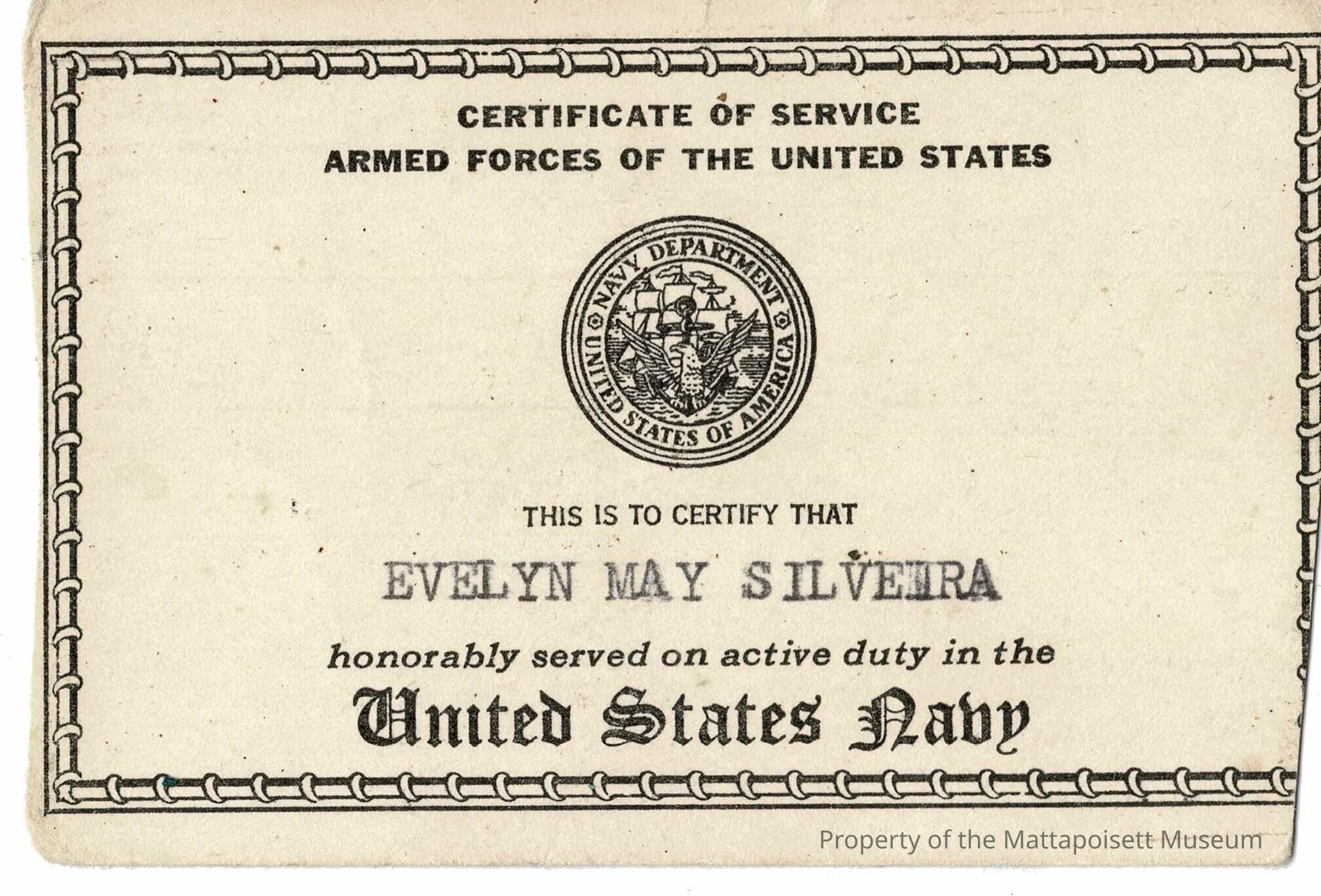 Certificate of service for Evelyn Pursley (nee Silveira) for her service in the US Navy.Acquisition