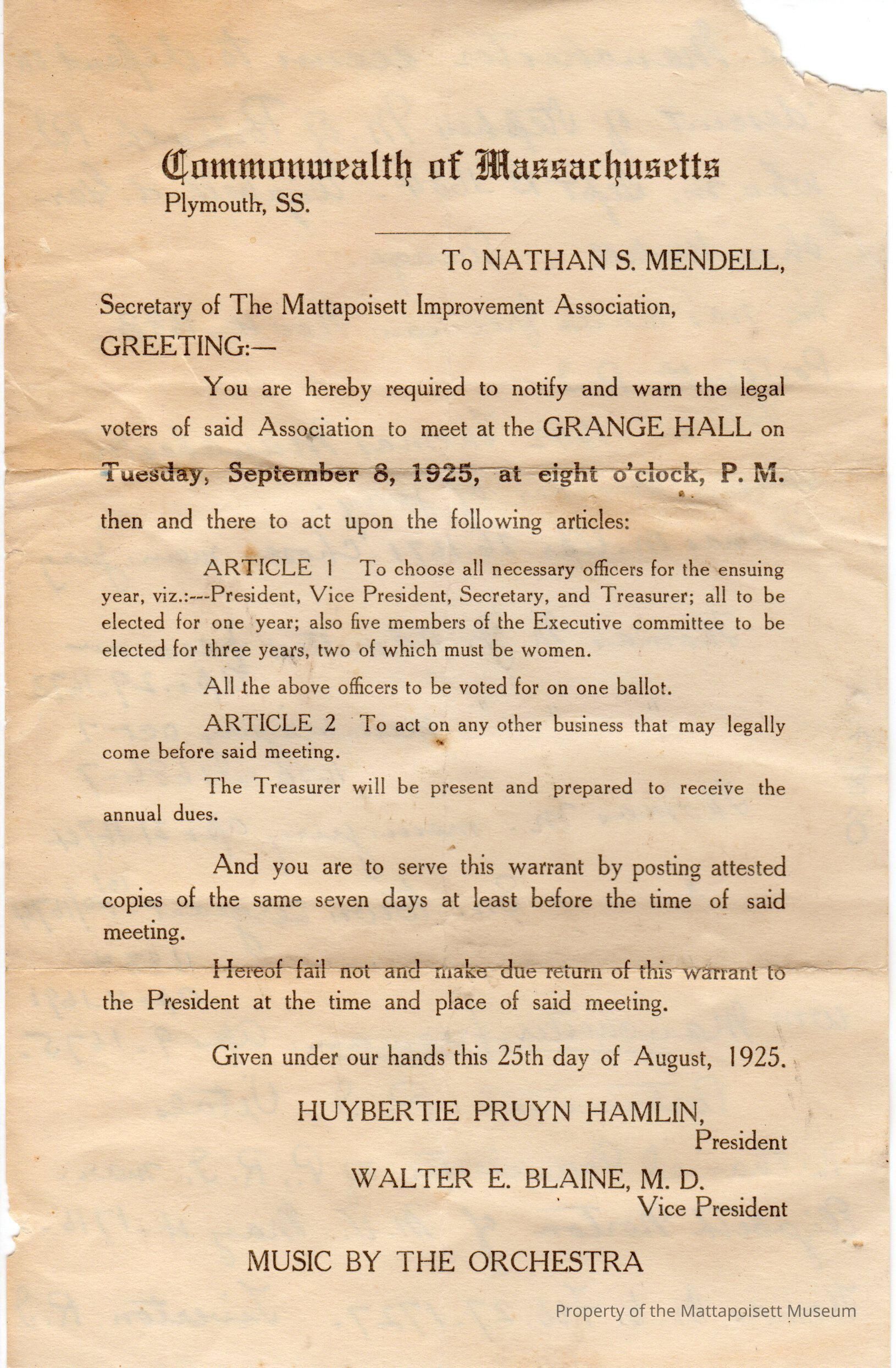 Notice about the Mattapoisett Improvement Association annual meeting to elect officers, etc. in 1925.