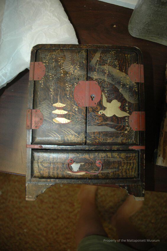 Black wooden mini-chest for jewlery Oriental scene painted on in red and gold with pagoda and swans 5 1/2"x8"x3 1/4" 3 drawers inside two wooden doors 1 drawer outside with drawer pulls owned by Henry Dunseith
