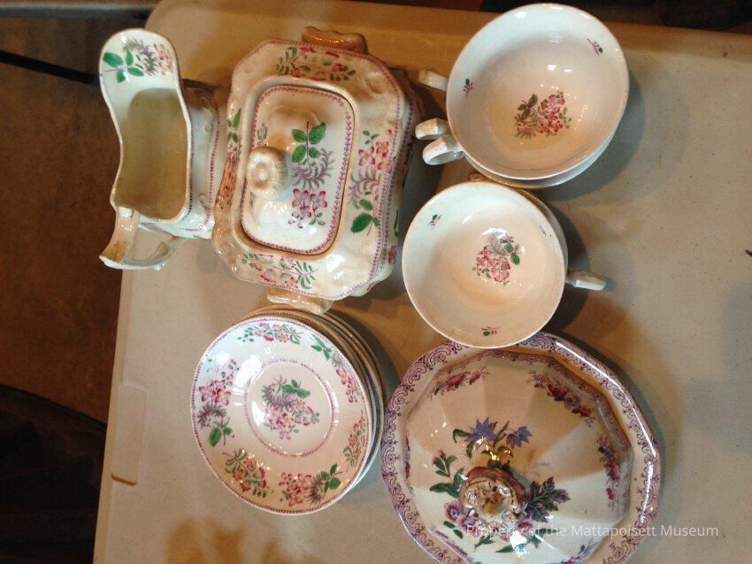 Pink. Teapot, creamer & sugarbowl; Large bowl with plate, 4 cups with handles (2 without), 6 saucers, milk pitcher (oriental pattern), 3 piece covered butter dish.Collection