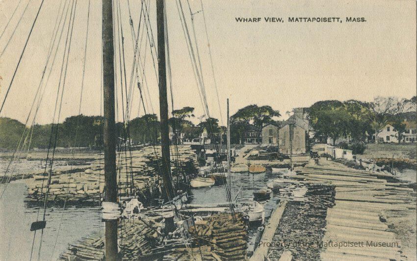 Hand-colored postcard showing the Wharf View, Mattapoisett, Mass. Pre-addressed name and address of Alice C. Ordway, North Street, Mattapoisett, Massachusetts.Collection