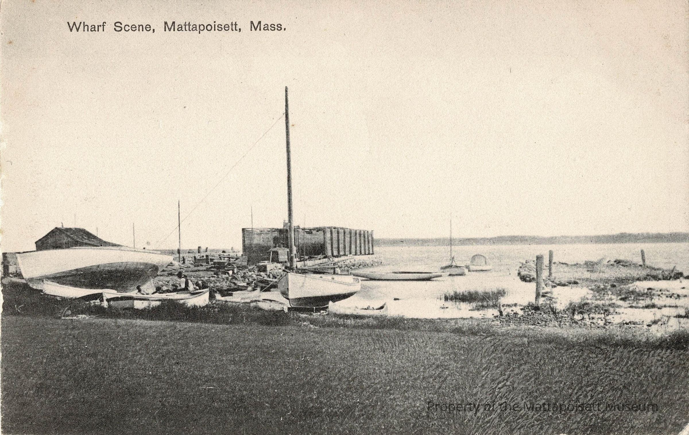 Black and white postcard showing Wharf Scene, Mattapoisett, Mass.Collection