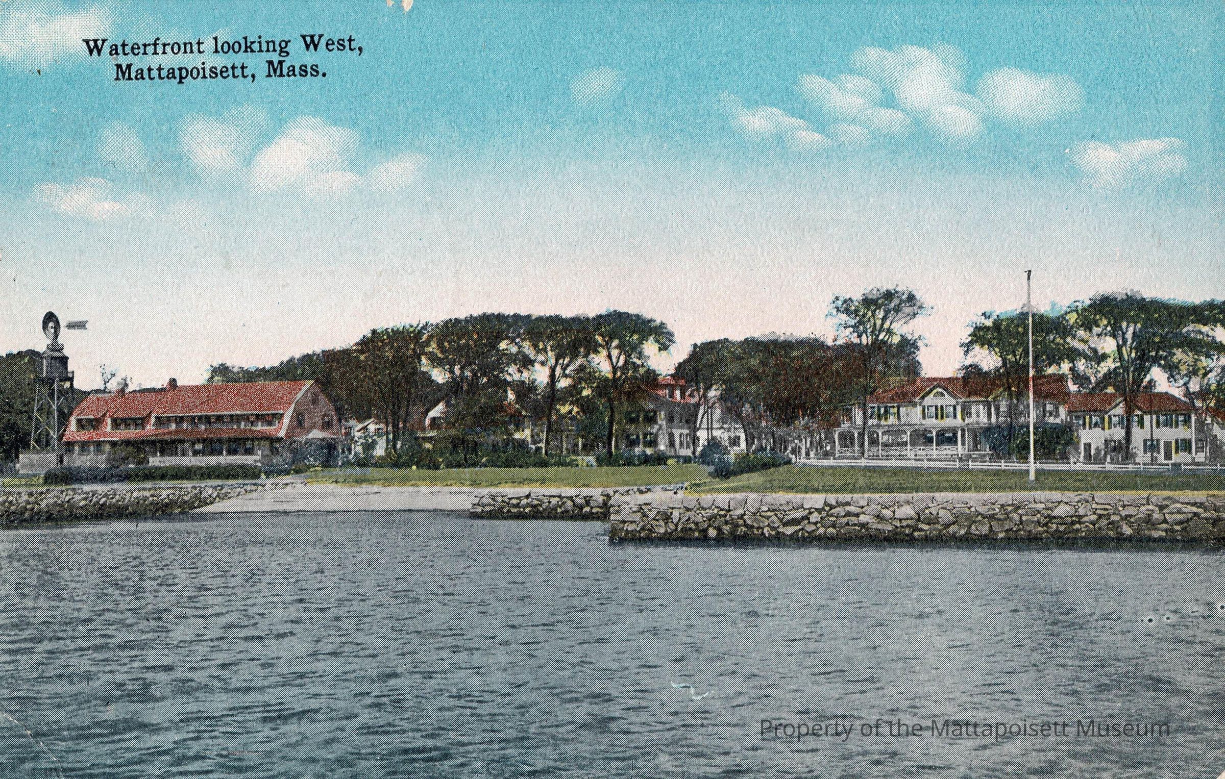 Hand-colored postcard showing Waterfront looking West, Mattapoisett, Mass. Correspondence from H.B.A to Mrs. Crosby, Mattapoisett, Mass. and postmarked Aug 30, 1915.Collection