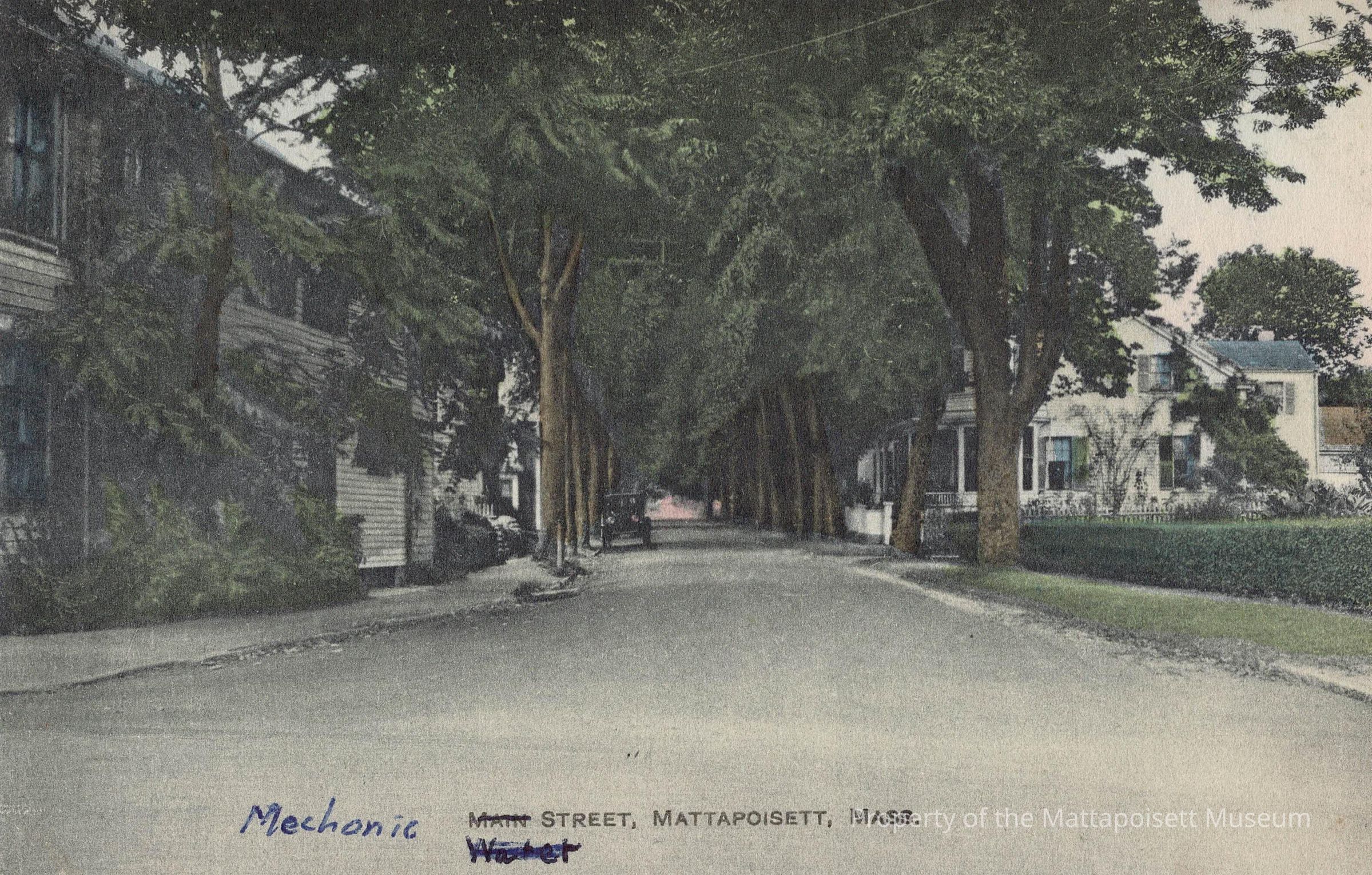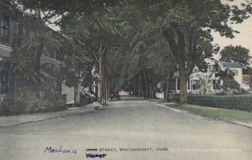 Hand-colored postcard showing Mechanic Street, Mattapoisett, Mass. Main crossed out and Mechanic handwritten. Water handwritten under Main and crossed out.Collection
