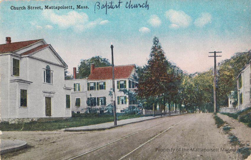 Hand-colored postcard showing Church Street, Mattapoisett, Mass. Handwritten "Baptist Church".Collection