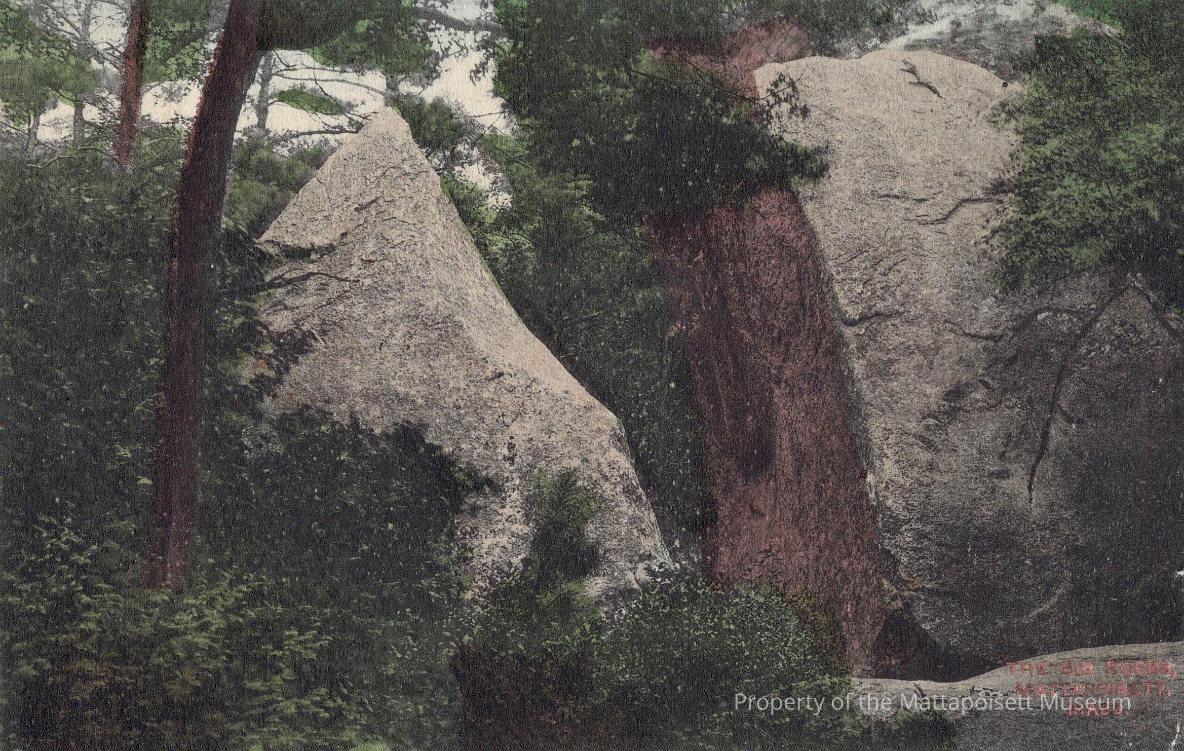 Hand-colored postcard showing The Big Rocks, Mattapoisett, Mass. Pre-addressed name and address of Alice C. Ordway, North Street, Mattapoisett, Massachusetts.Collection