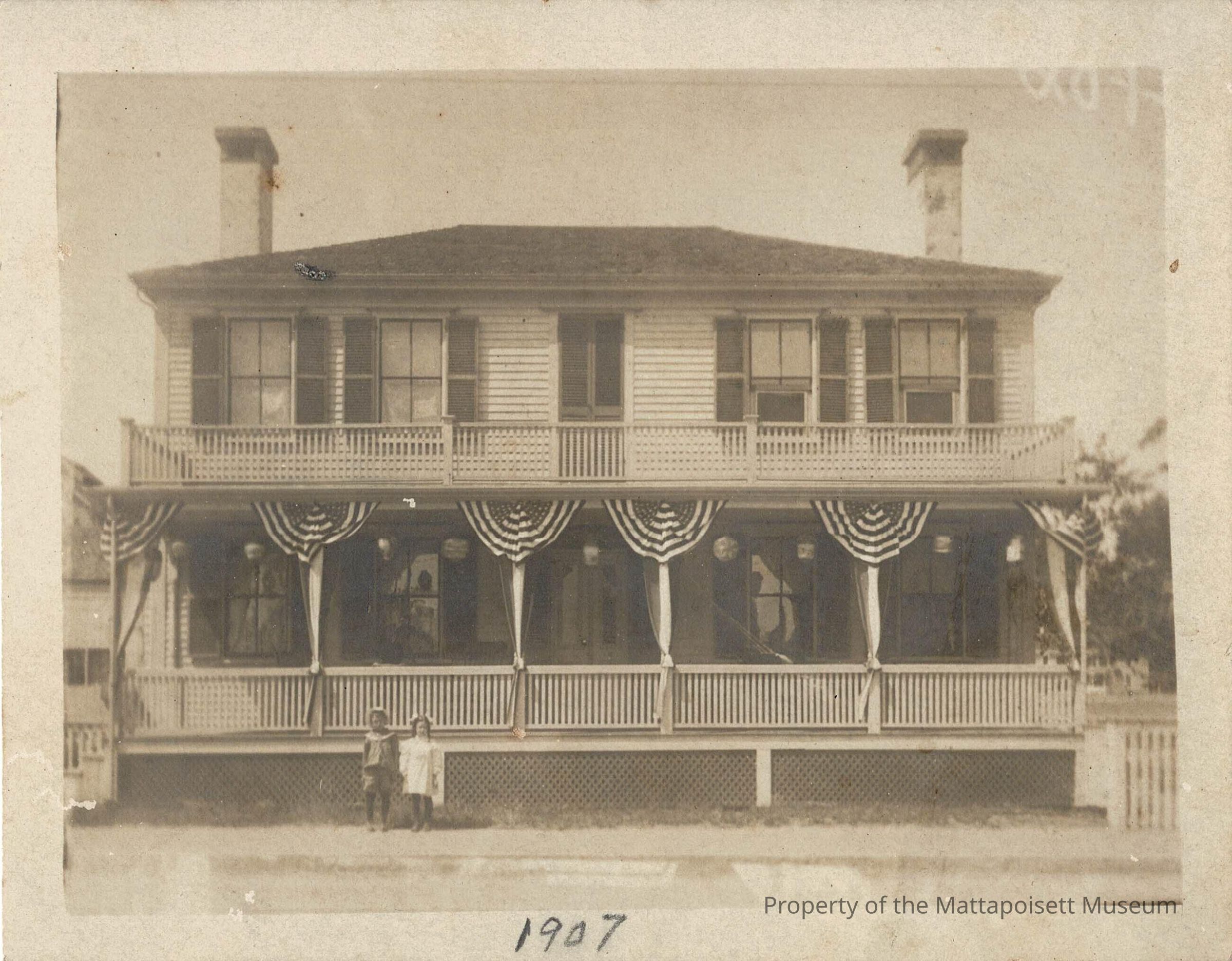 Black and white postcard of two children in front of home.in Mattapoisett, Mass. Hand-written date 1907 at bottom of postcard.Collection