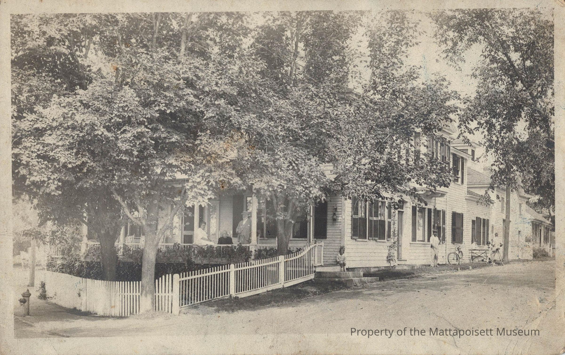Black and white postcard showing a tree lined street in Mattapoisett, Mass. Handwritten in ink annotation on back "Taken August 1916 Daddy's writing; The Munroe House - Mattapoiset" with additional pencil annotation "Pearl and Water St.".Collection