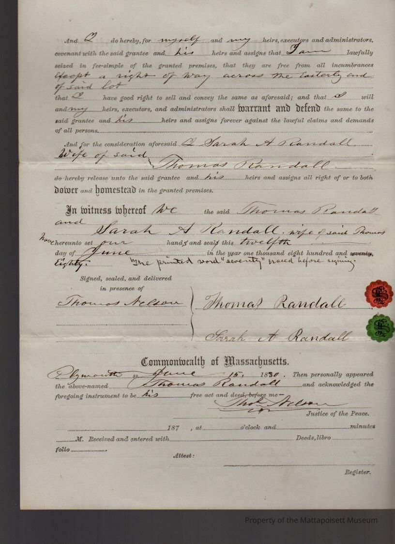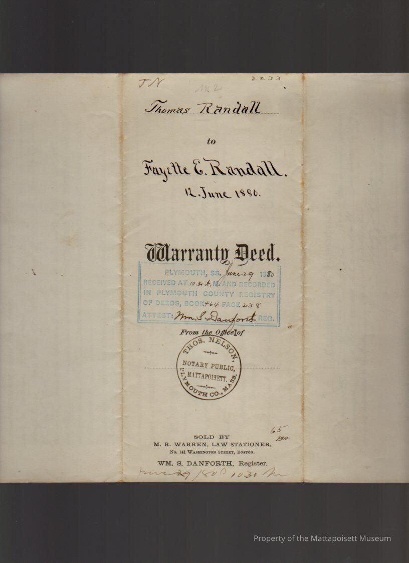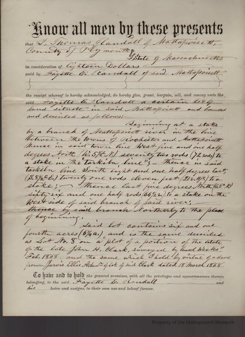 Thomas & Sarah A. Randall to Fayette E. Randall, 6 ½ acres land near Mattapoisett River for $18. Original.Collection