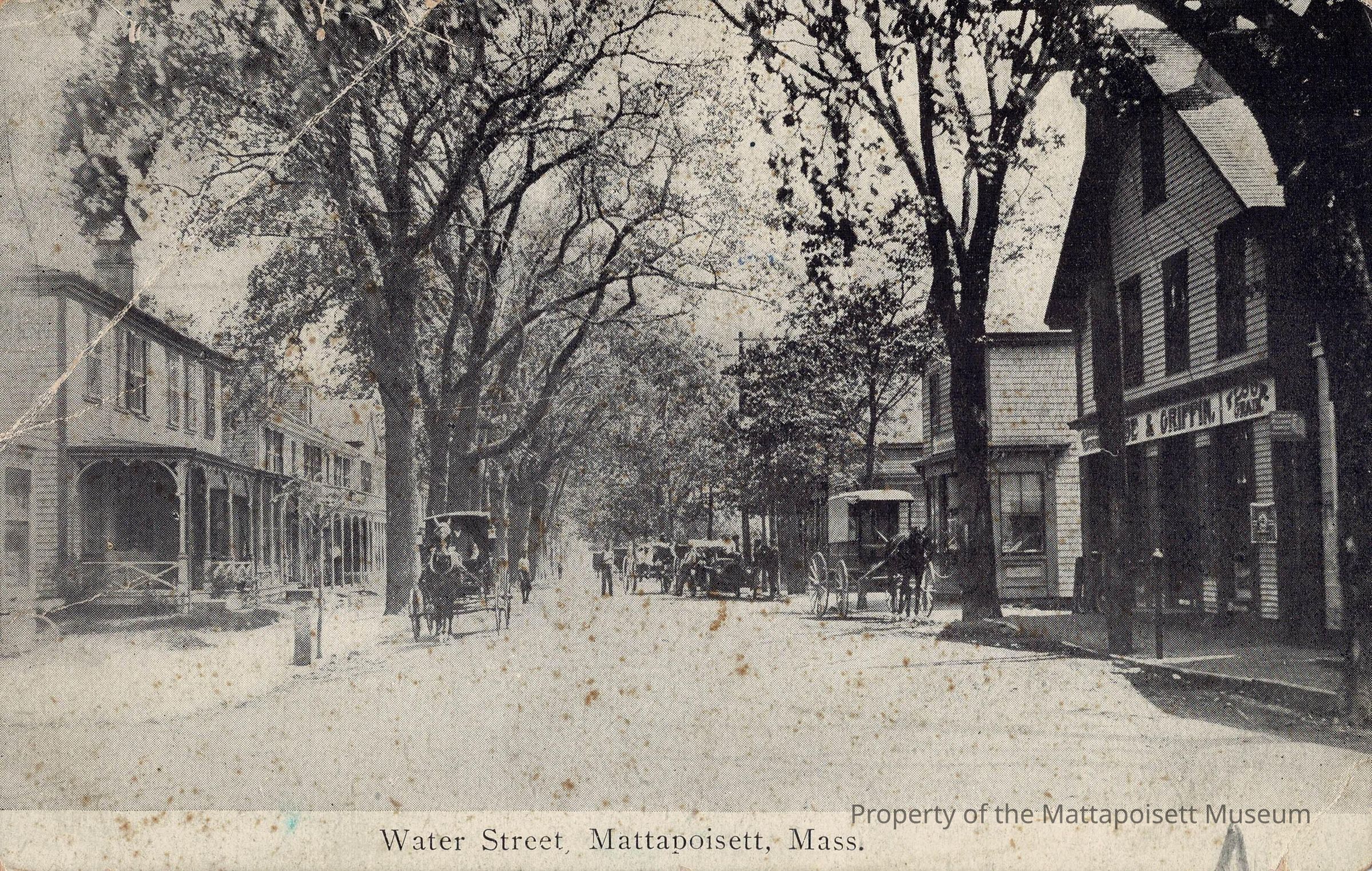 Black and white postcard showing Water Street, Mattapoisett, Written on reverse in ink "Return to"; stamped on reverse "Jonathan H. Holmes, Mattapoisett, Mass."Collection