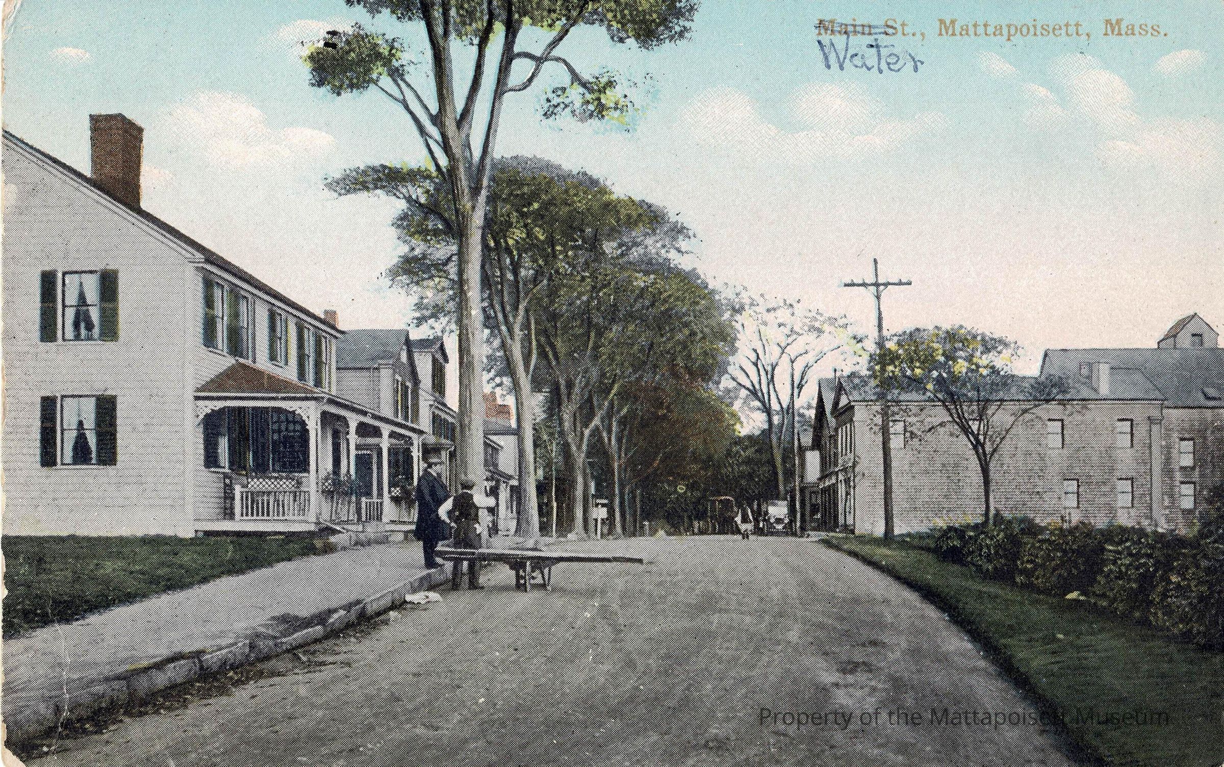 Hand-colored postcard showing Water (written in ink and Main crossed out) Street, Mattapoisett, Mass.Collection