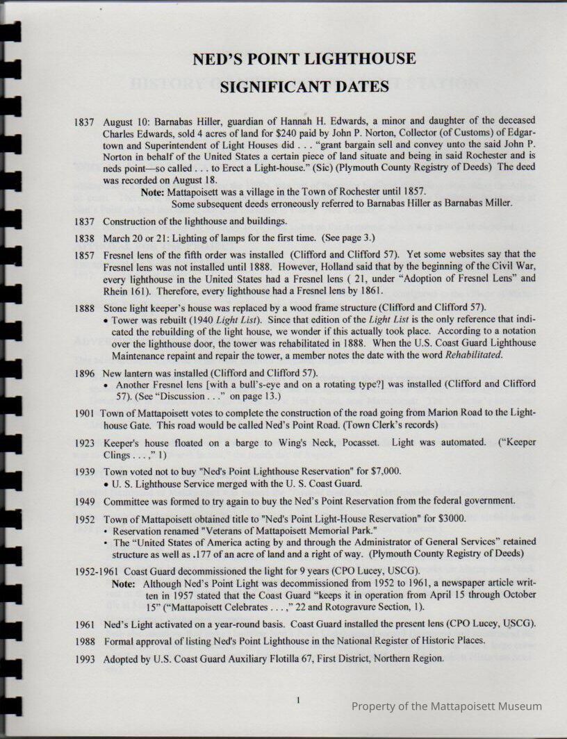Ned's Point Lighthouse, a Chronicle and Related Information by Albert A Theriault Jr. and Elizabeth A Theriault.Collection